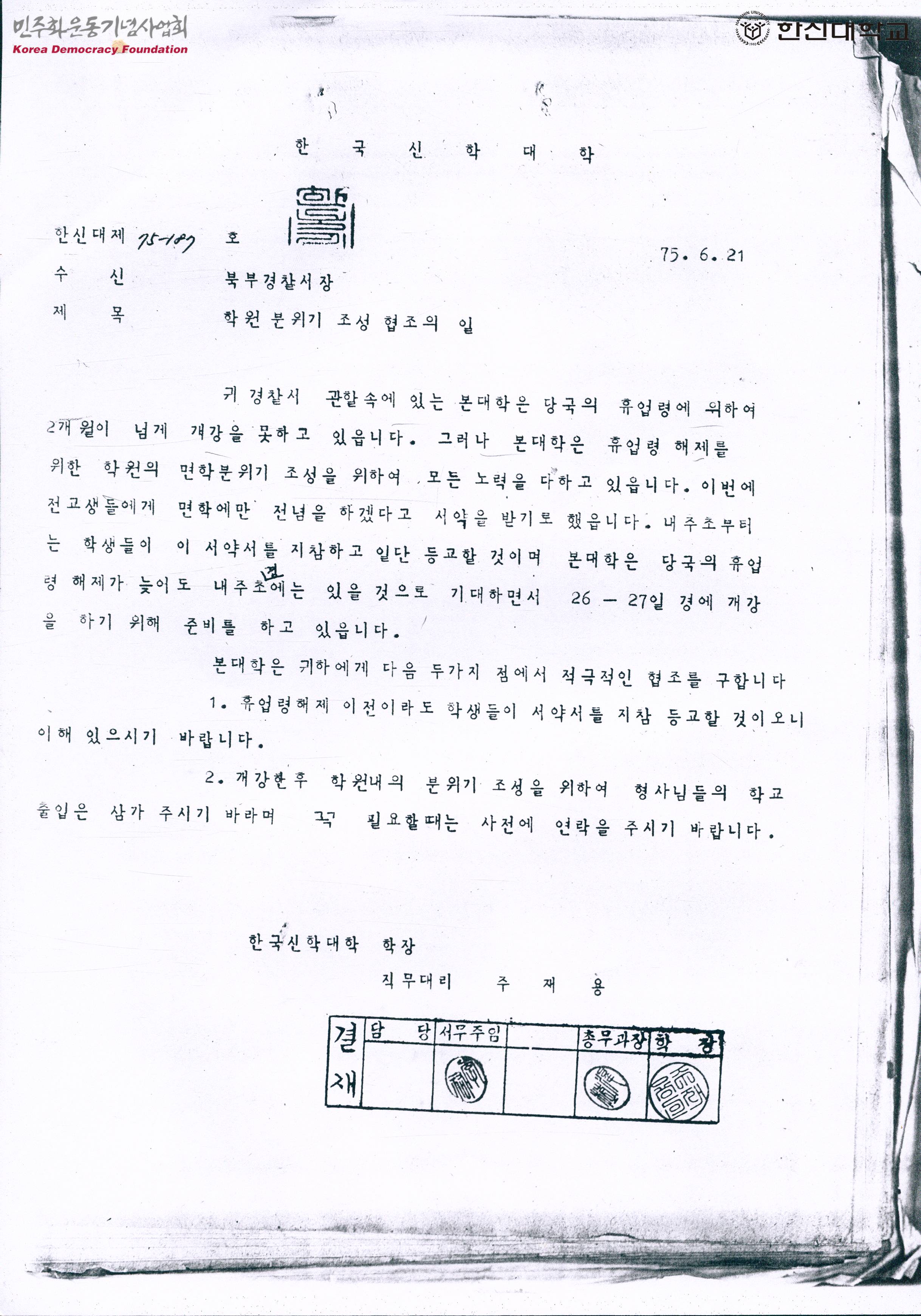 - 휴업령 해제를 위해 모든 학생들에게 서약을 받기로 했다며 휴업령 해제 이전이라도 학생들이 서약서를 지참하여 등교할 것이니 이해를 바란다는 것, 형사들의 학교 출입을 삼가주고 꼭 필요할 때는 사전에 연락을 달라는 것을 부탁하는 내용의 문서