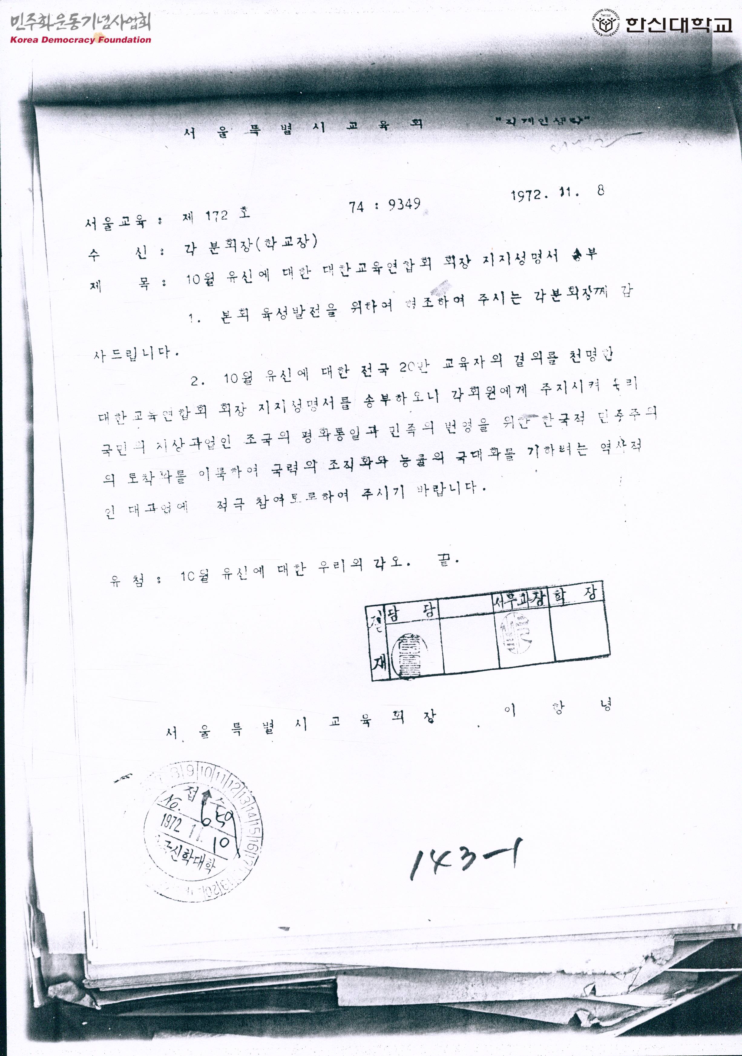 - 10월 유신에 대한 전국 20만 교육자의 결의를 천명한 대학교육연합회 회장 지지성명서를 송부하니 각 회원에게 주지시켜 국민의 지상과업인 평화통일과 민주주의 토착화를 이룩하는 역사적인 대과업에 적극 참여토록 해달라는 내용의 문서