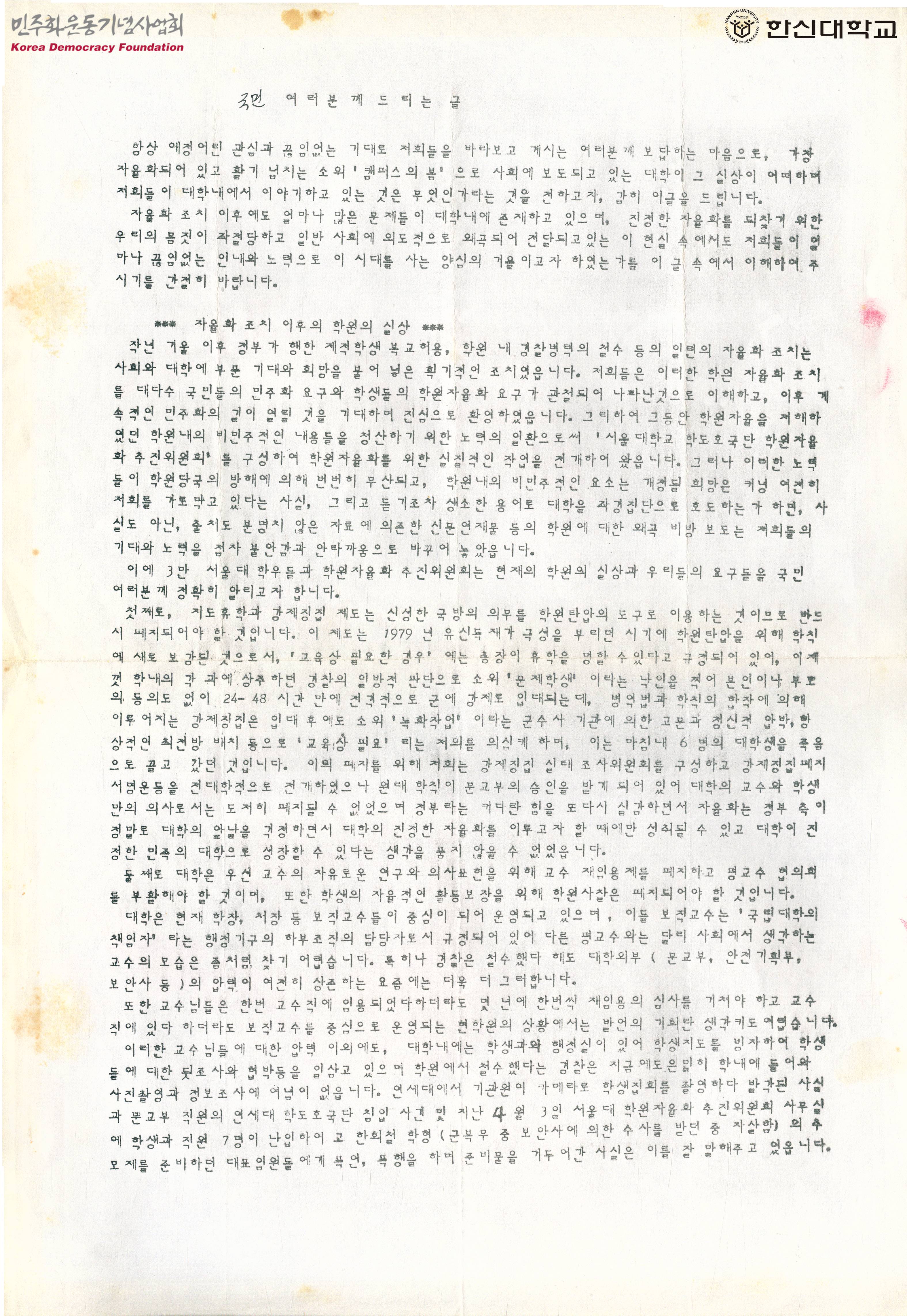 국민 여러분께 드리는 글[학원 자율화 조치 이후 대학가 상황]