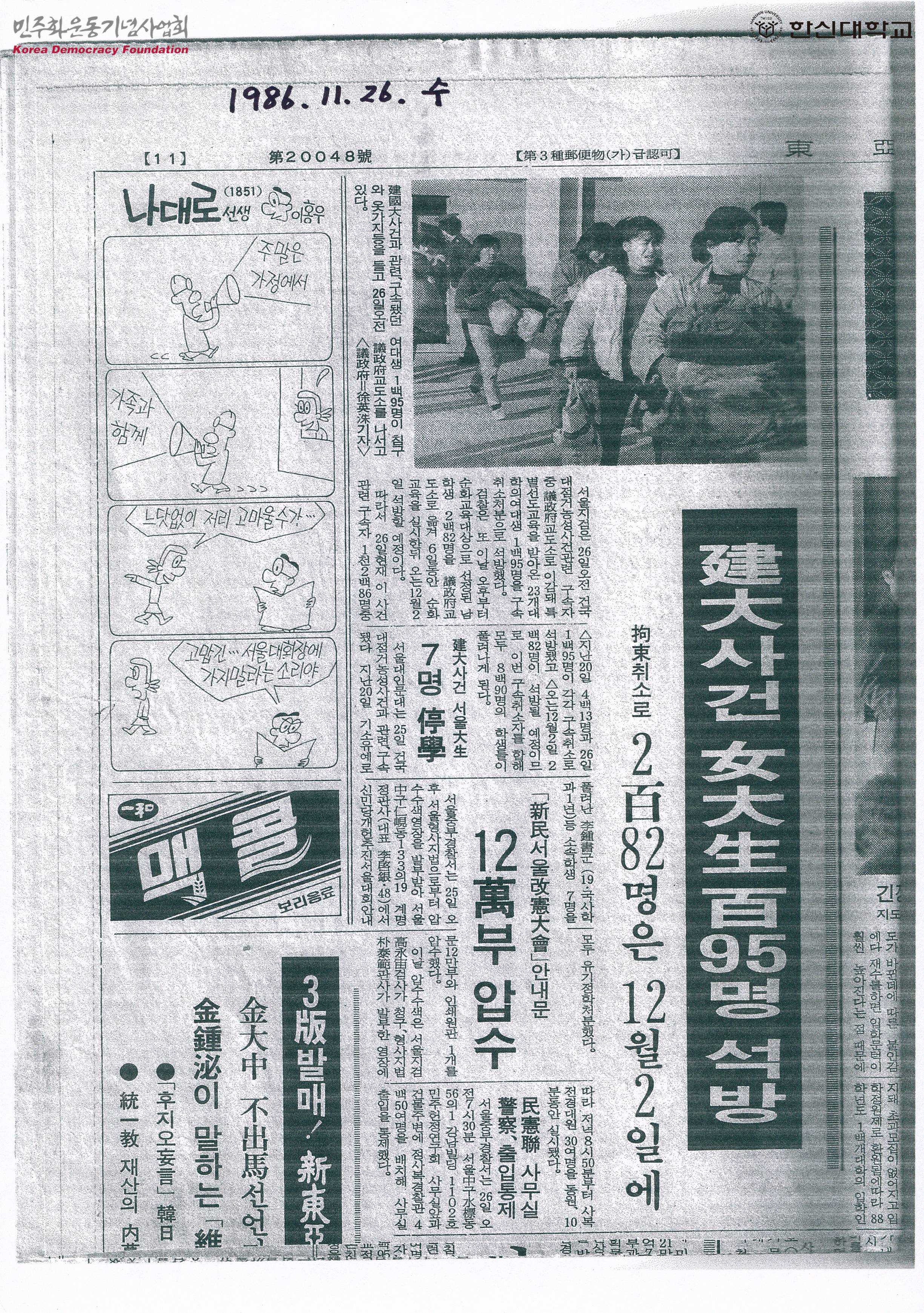 - 건국대 점거농성 사건으로 구속된 대학생들 중 의정부교도소로 이감되어 특별선도교육을 받아온 여대생 195명에게 구속 취소 처분을 내리고 석방했다는 내용의 기사