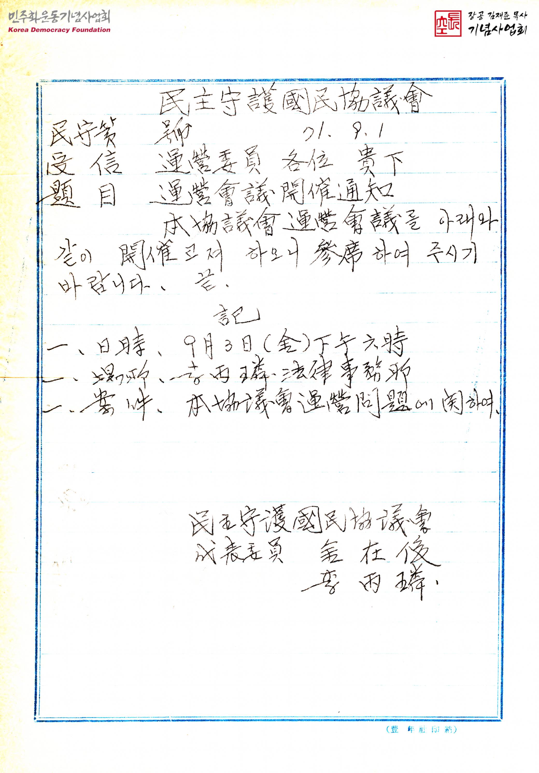 - 민주수호국민협의회 운영에 대한 문제를 다루는 운영회의를 열고자 하니 참석을 요청하는 내용의 문서