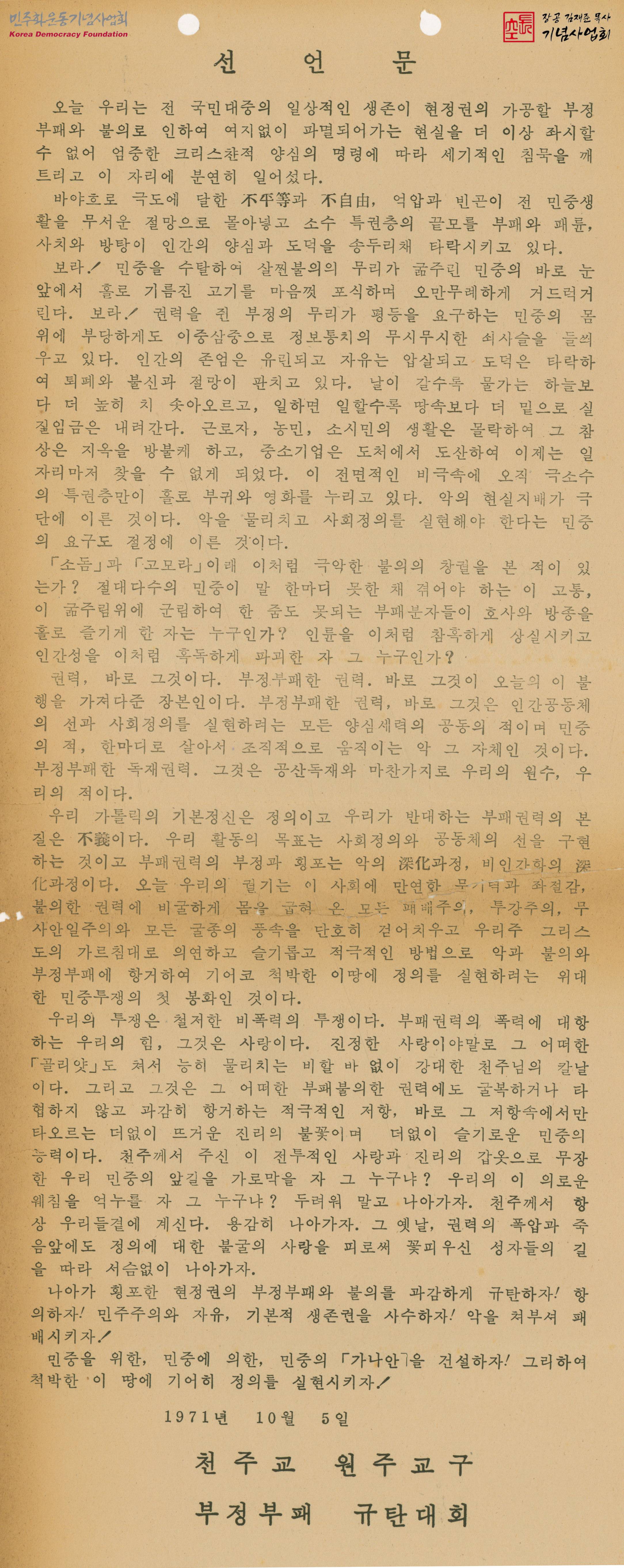 - 오늘날의 전 국민의 일상적인 생존이 현정권의 부정과 부패로 파멸되어 가는 것을 좌시할 수 없기에 분연히 일어섰다는 것, 횡포한 현정권의 부정부패와 불의를 과감하게 규탄해 민주주의와 자유, 기본적 생존권을 사수하자는 것, 이 땅에 정의를 실현시키자는 것 등의 내용이 적힌 선언문