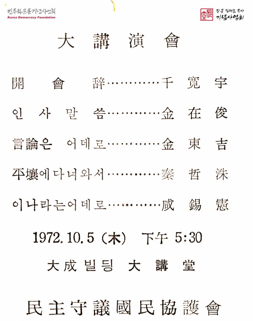 - 대강연회 식순이 적힌 안내지로 식순은 다음과 같음 - 개회사 - 인사말씀 - 언론은 어데로 - 평양에 다녀와서 - 이나라는 어데로