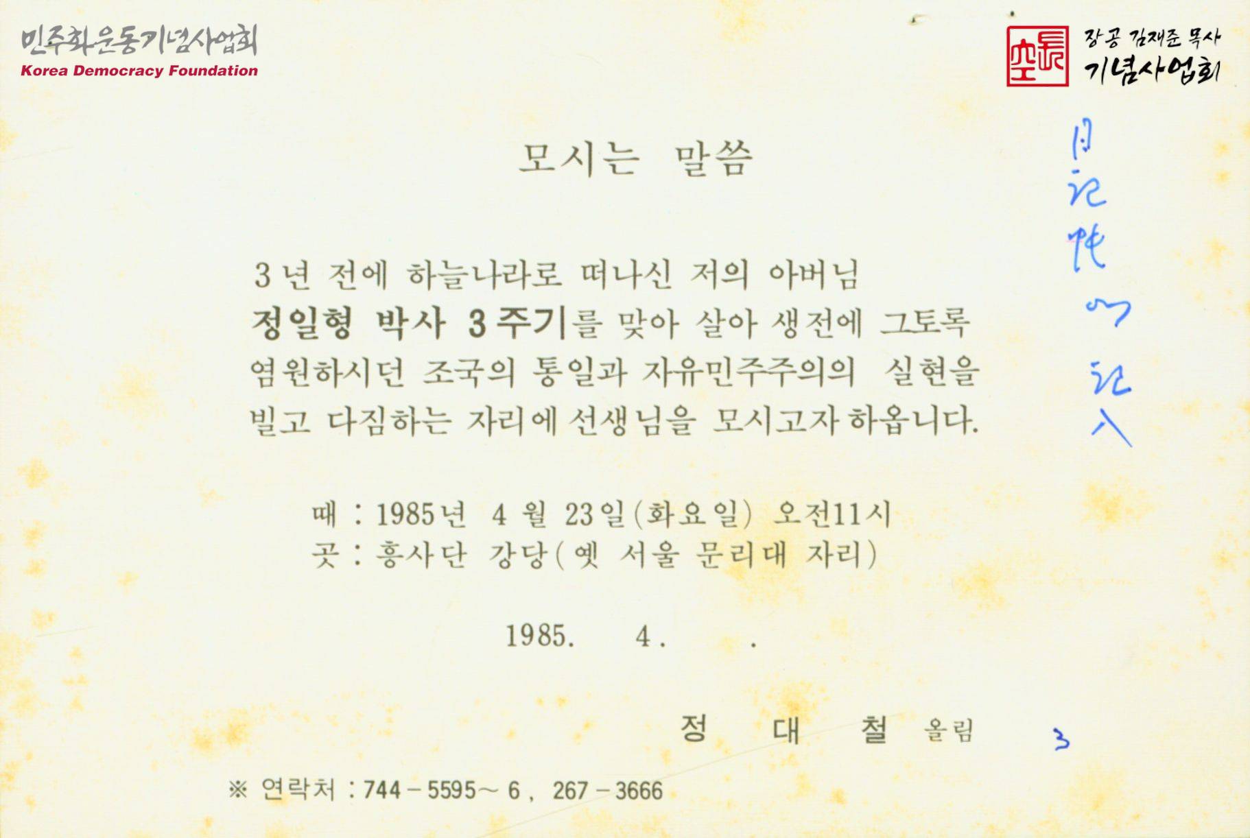 - 정일형 박사의 3주기를 맞아 조국의 통일과 자유민주주의의 실현을 빌고 다짐하는 자리에 초대한다는 내용의 초청장