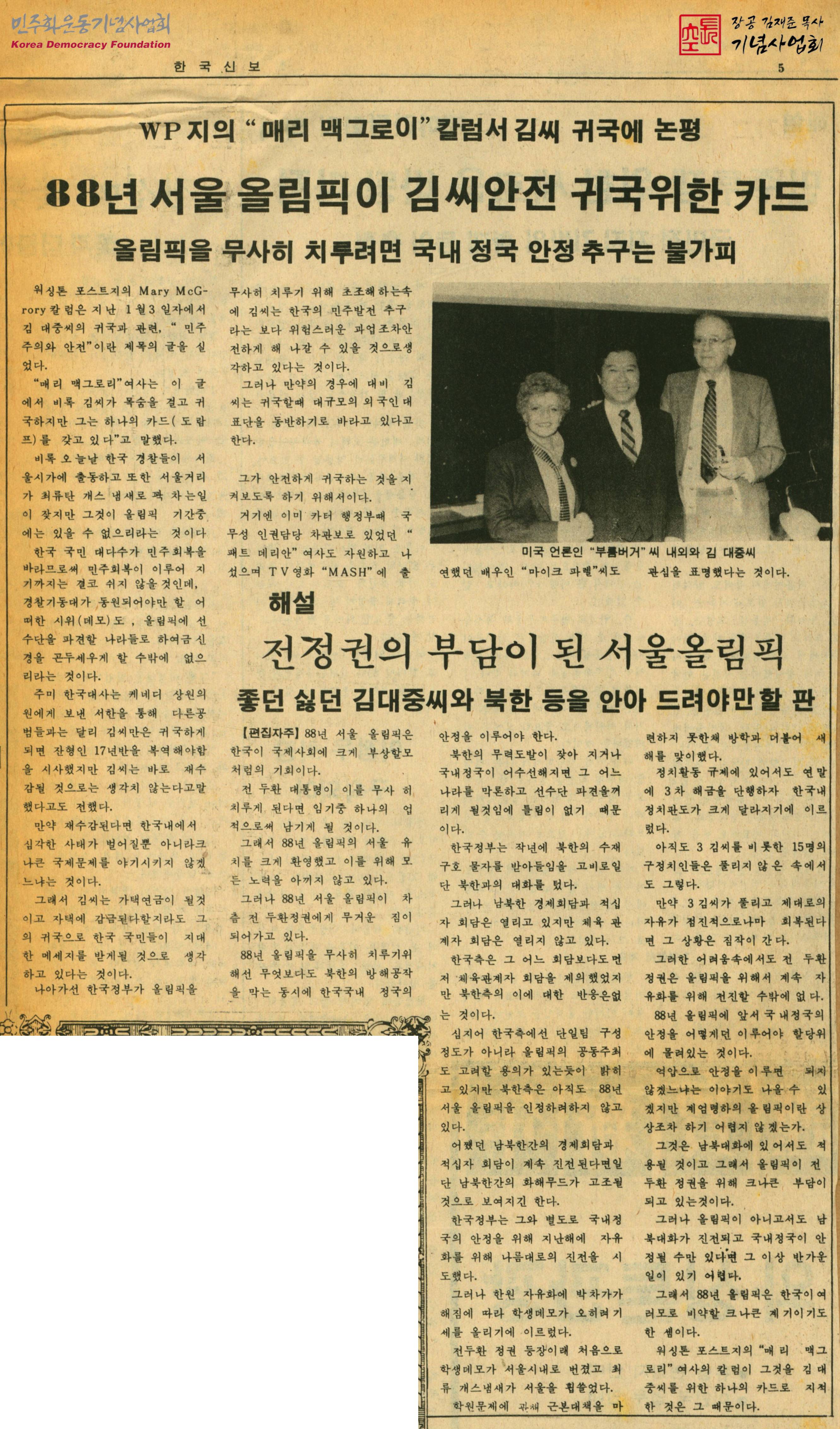 - 김대중의 귀국과 관련해 올림픽을 앞두고 김대중을 구속시켜 큰 문제를 야기하지 않을 것이라는 전망과 만약의 경우에 대비해 대규모의 외국인 대표단을 동반하기로 바라고 있다는 내용, 올림픽을 무사히 치르기 위해서는 북한의 방해공작을 막는 동시에 국내 정국의 안정을 이뤄야 해 서울올림픽이 전두환 정권의 부담이 되었다는 내용이 수록된 신문스크랩