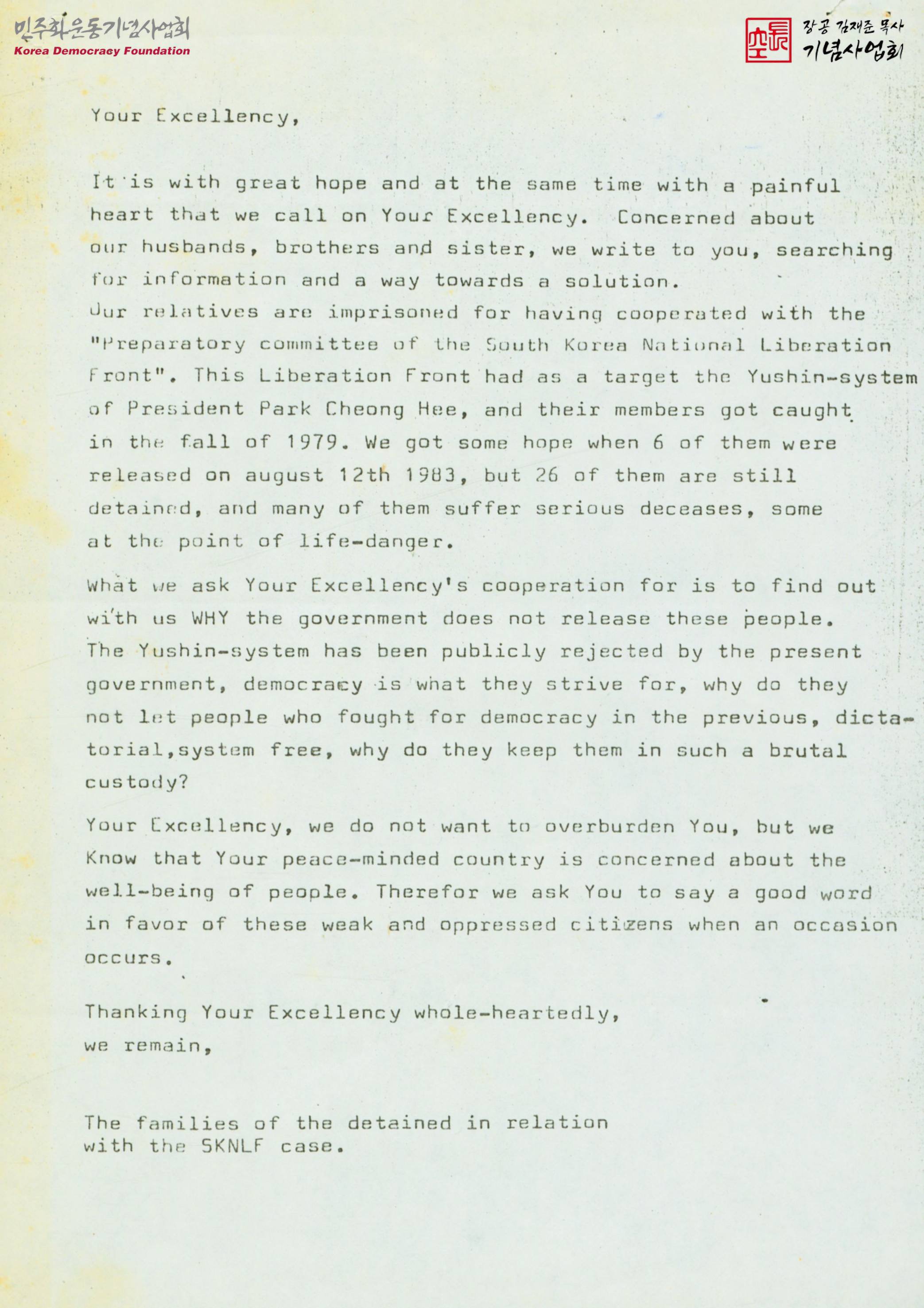 - 남조선민족해방전선준비위원회에 연루되었다는 혐의로 구속된 가족들, 박정희 대통령의 사망 이후 1983년이 되었는데도 석방되지 못한 26명, 정부의 미석방 수감자 관련 조사 협조 요청 등의 내용이 수록된 편지로, 미석방된 수감자의 명단이 별첨되어 있음