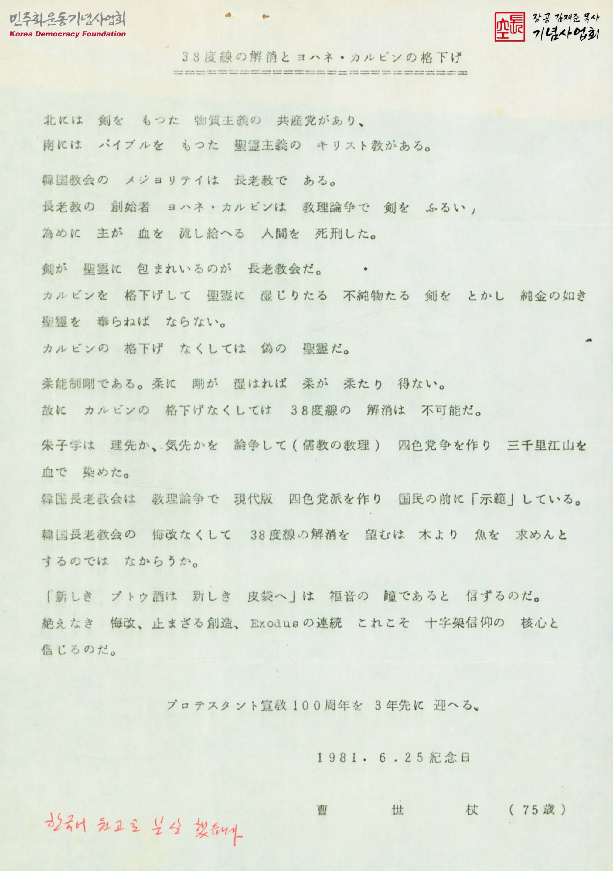 - 한국 교회의 다수인 장로교회, 장로교회의 현대판 사색당쟁, 한국장노교회의 회개 필요 등의 내용이 수록된 문서