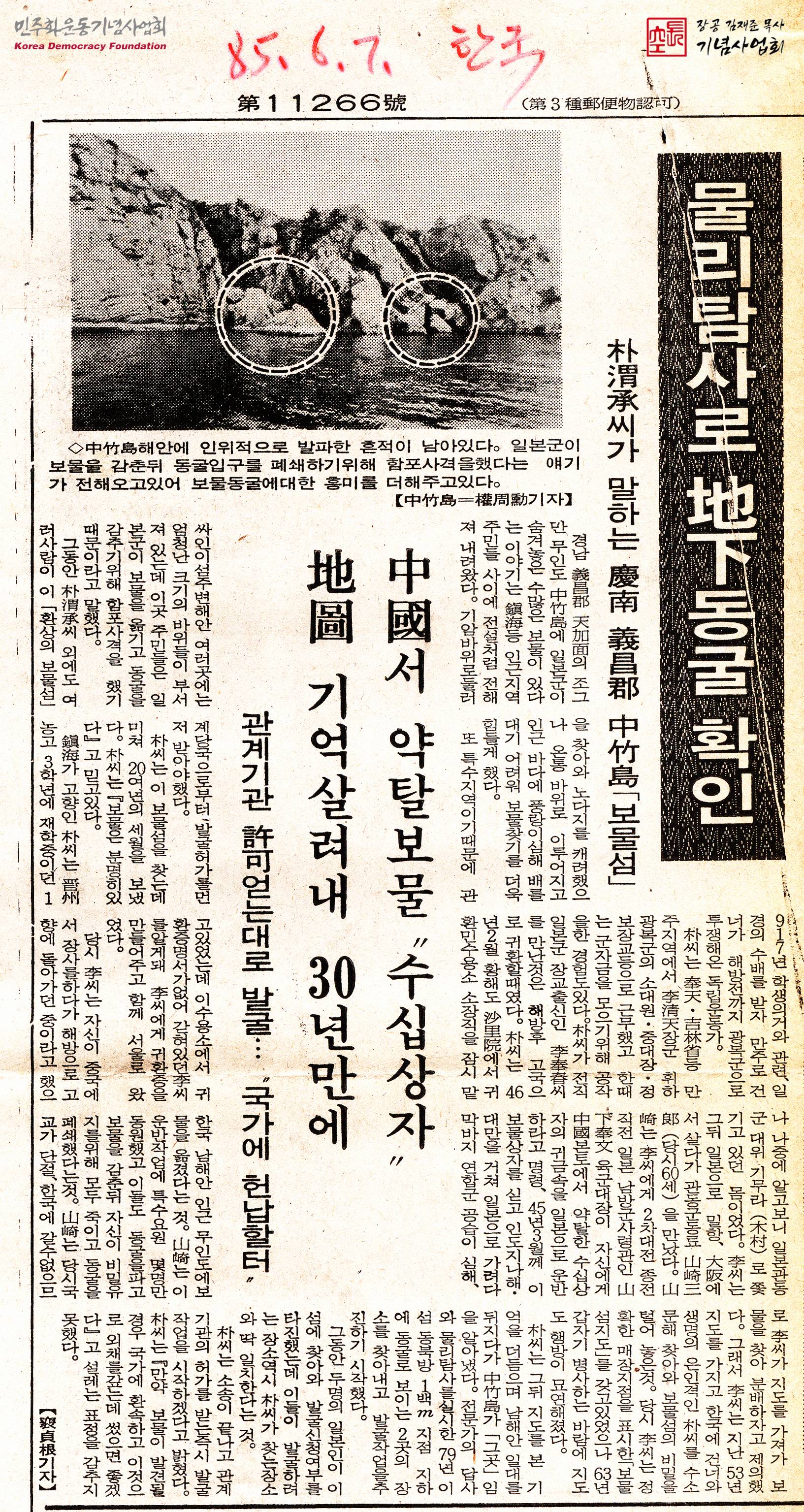 - 경상남도 거창군 천가면의 조그만 무인도 중죽도에 일본군이 숨겨놓은 수많은 보물이 있다는 내용, 이를 처음 알게 된 박위승 씨가 채굴권에서 승소한다면 관계기관의 허가를 받는 즉시 발굴작업을 시작하여 보물이 발견될 경우 국가에 환속하고 이것으로 외채를 갚는데 썼으면 좋겠다고 인터뷰하는 내용 등이 수록된 문서