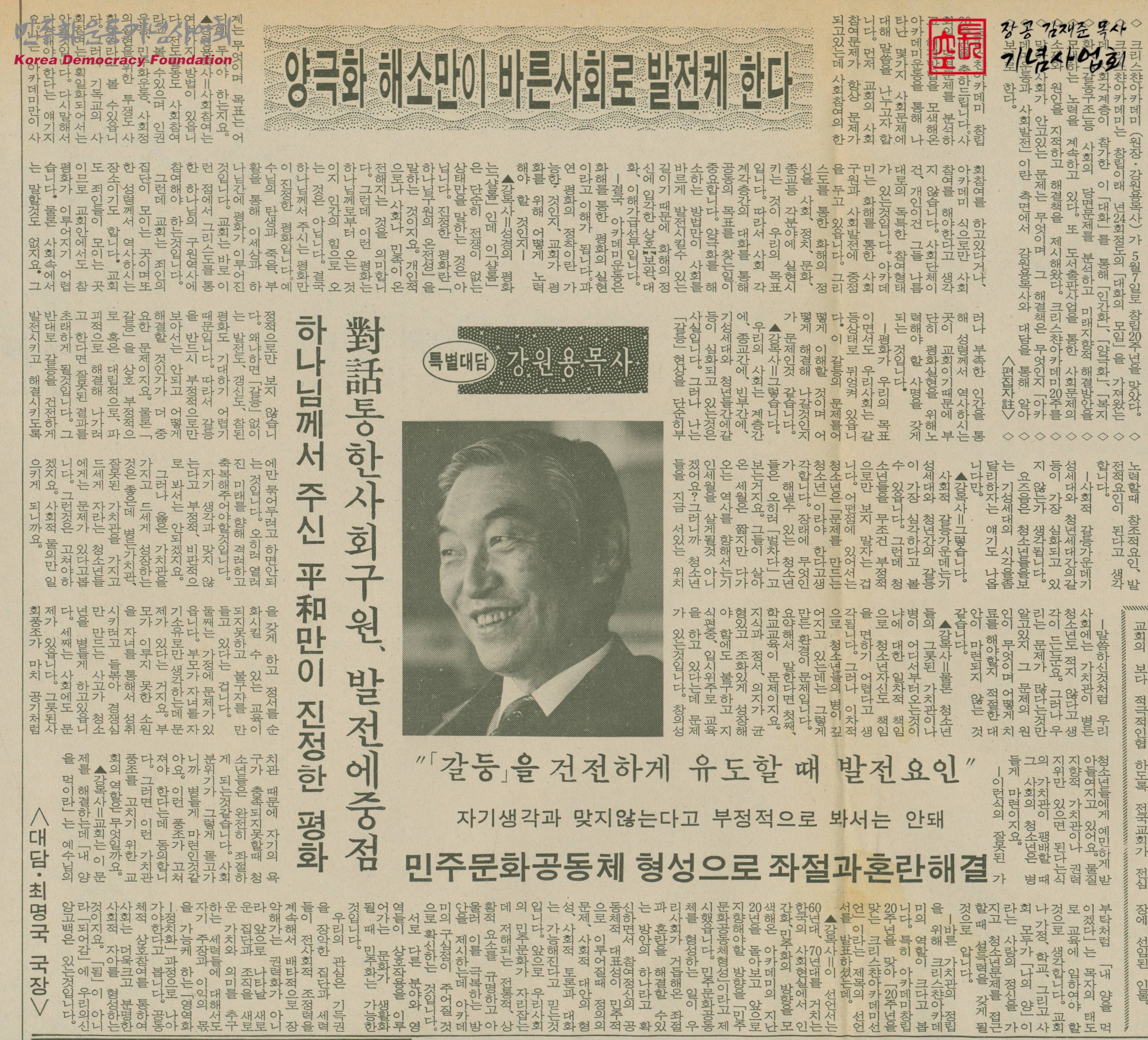 - 크리스찬아카데미의 20주년을 맞아 사회가 안고있는 문제는 무엇이며 그 해결책은 무엇인지 아카데미운동과 사회발전이라는 측면에서 강원용 목사와의 대담을 진행하고 있으며, 강원용 목사는 양극화 해소만이 바른사회로 발전하게 하며, 하나님께서 주신 평화만이 진정환 평화이며 민주문화공동체 형성으로 좌절과 혼란을 해결할 수 있다고 답변한 내용 등이 수록된 문서