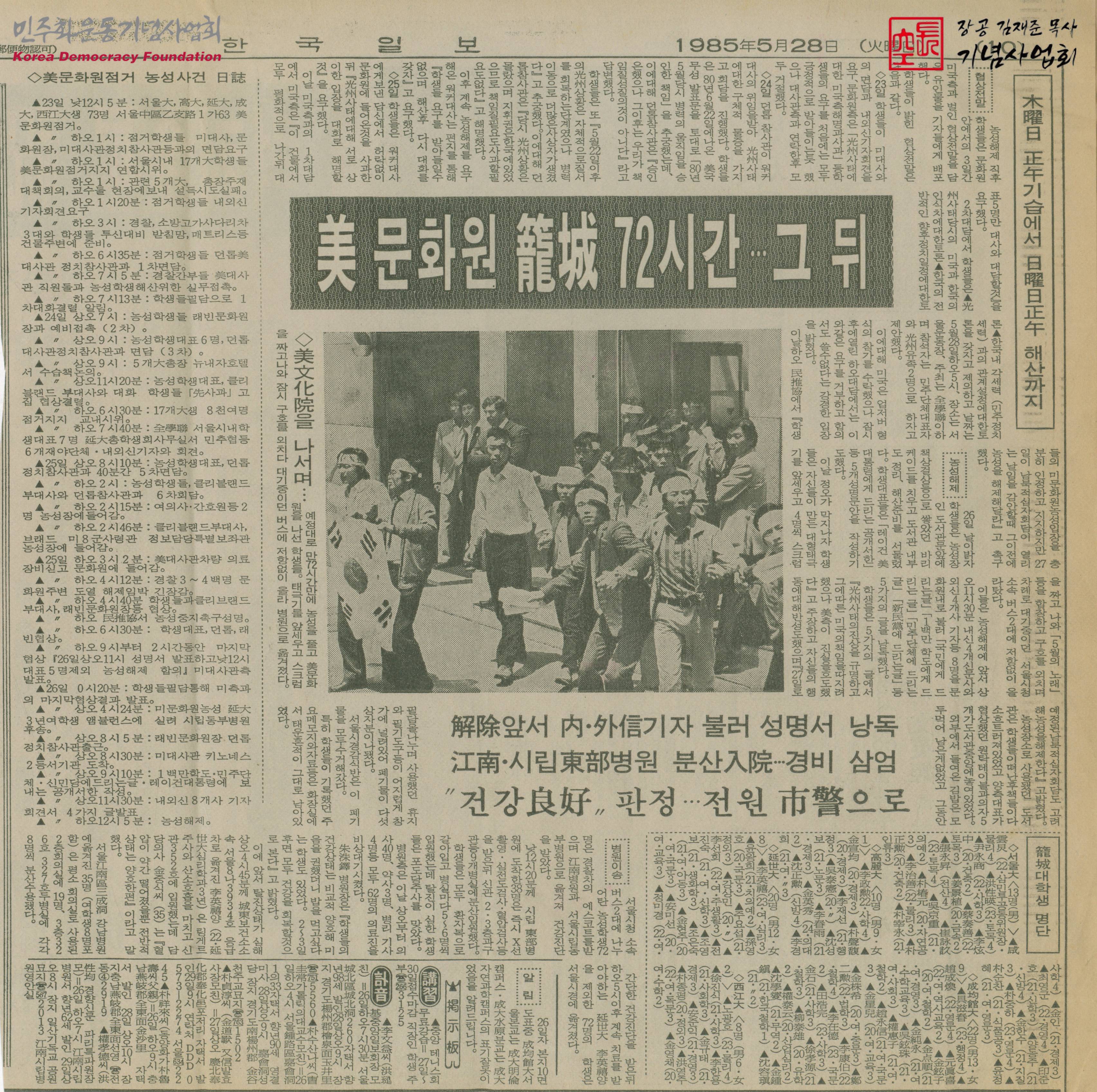 - 농성해제 직후 학생들은 미 문화원 안에서의 3일간 미국 측과 벌인 협상전말을 담은 유인물을 기자들에게 배포했다는 내용, 농성해제에 앞서 내·외신 기자를 불러 성명서를 낭독했다는 내용, 미 문화원 점거 농성사건 일지 등이 수록된 문서