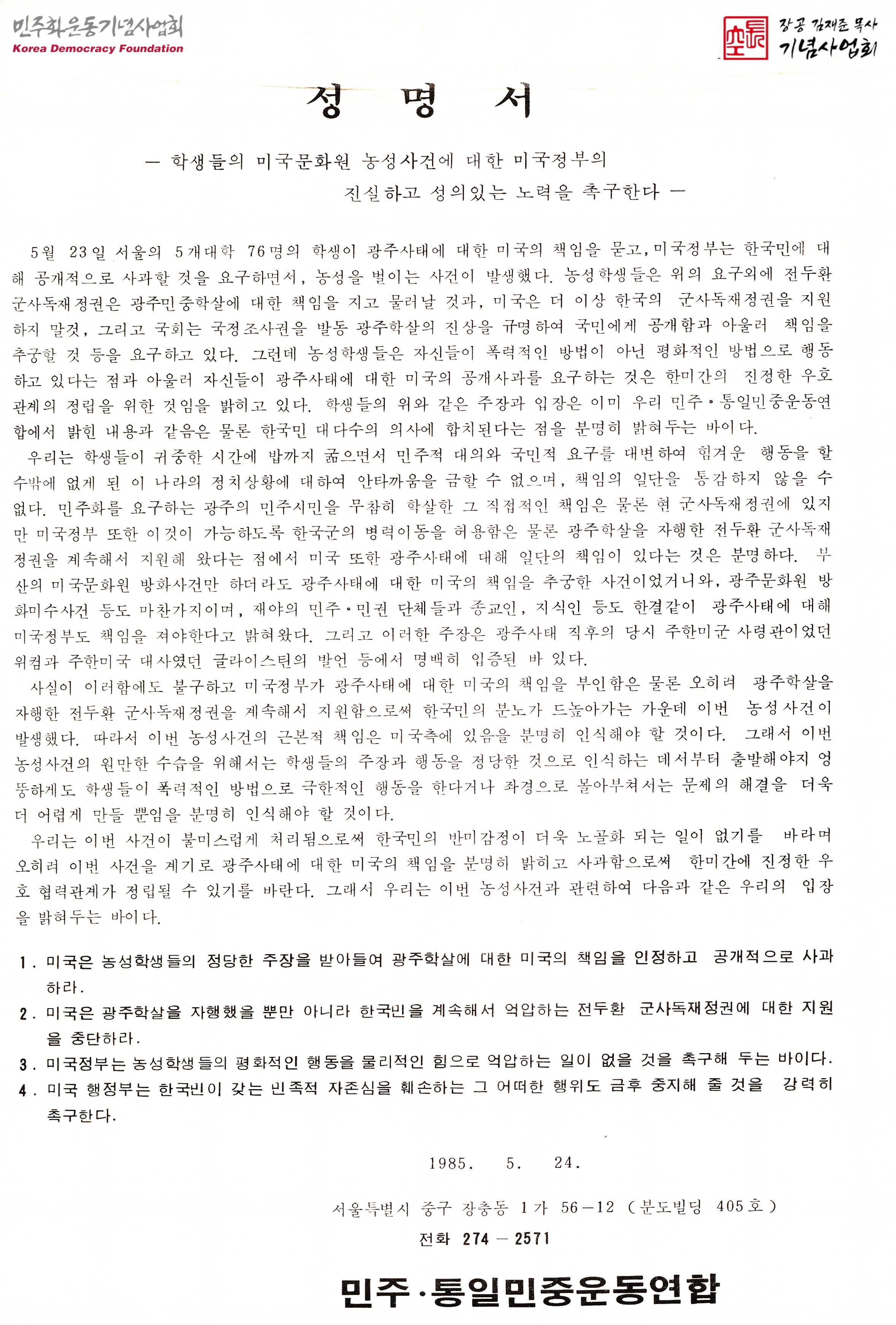 성명서 - 학생들의 미국문화원 농성사건에 대한 미국정부의 진실하고 성의있는 노력을 촉구한다