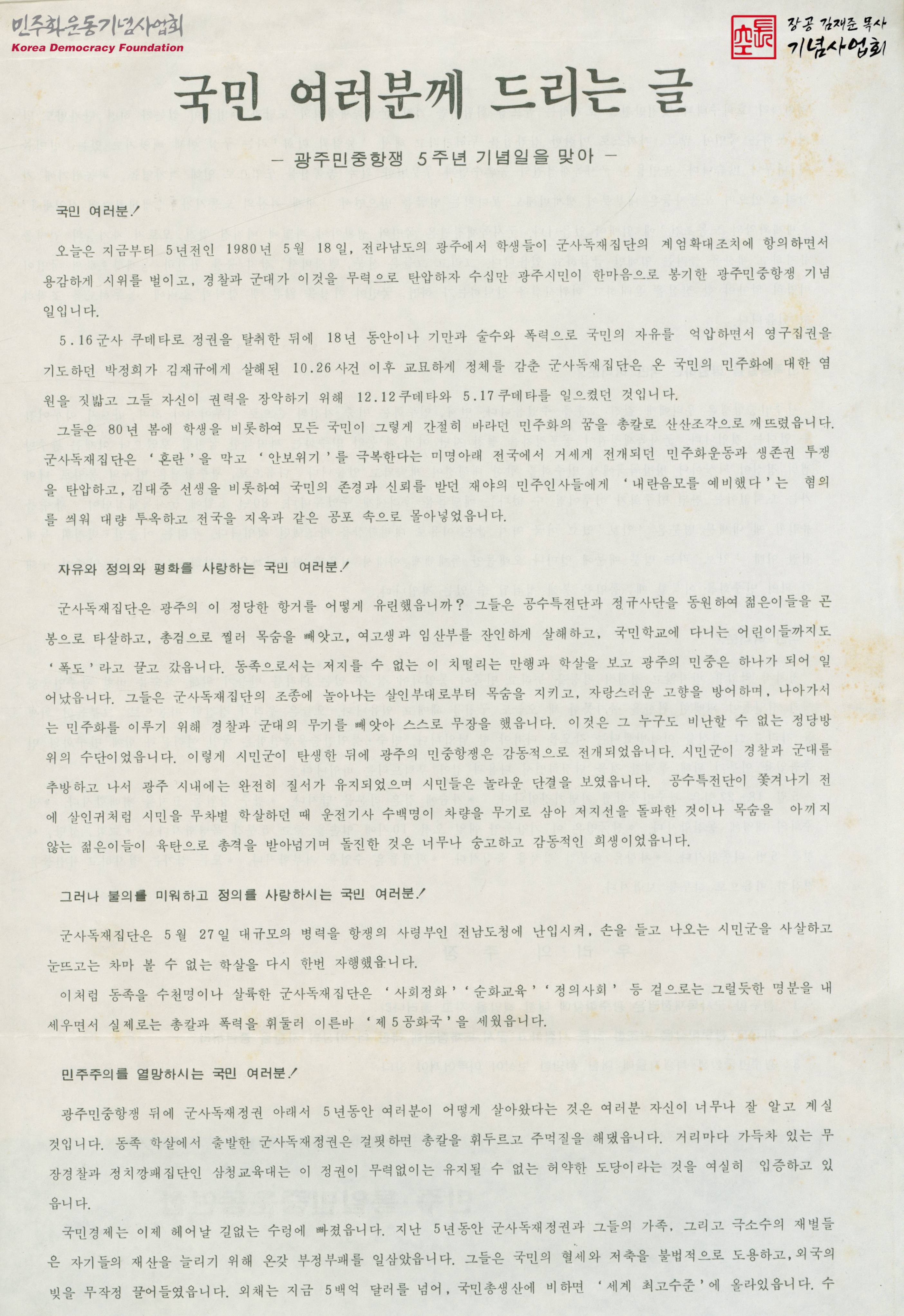 국민여러분들께 드리는 글 - 광주민중항쟁 5주년 기념일을 맞아