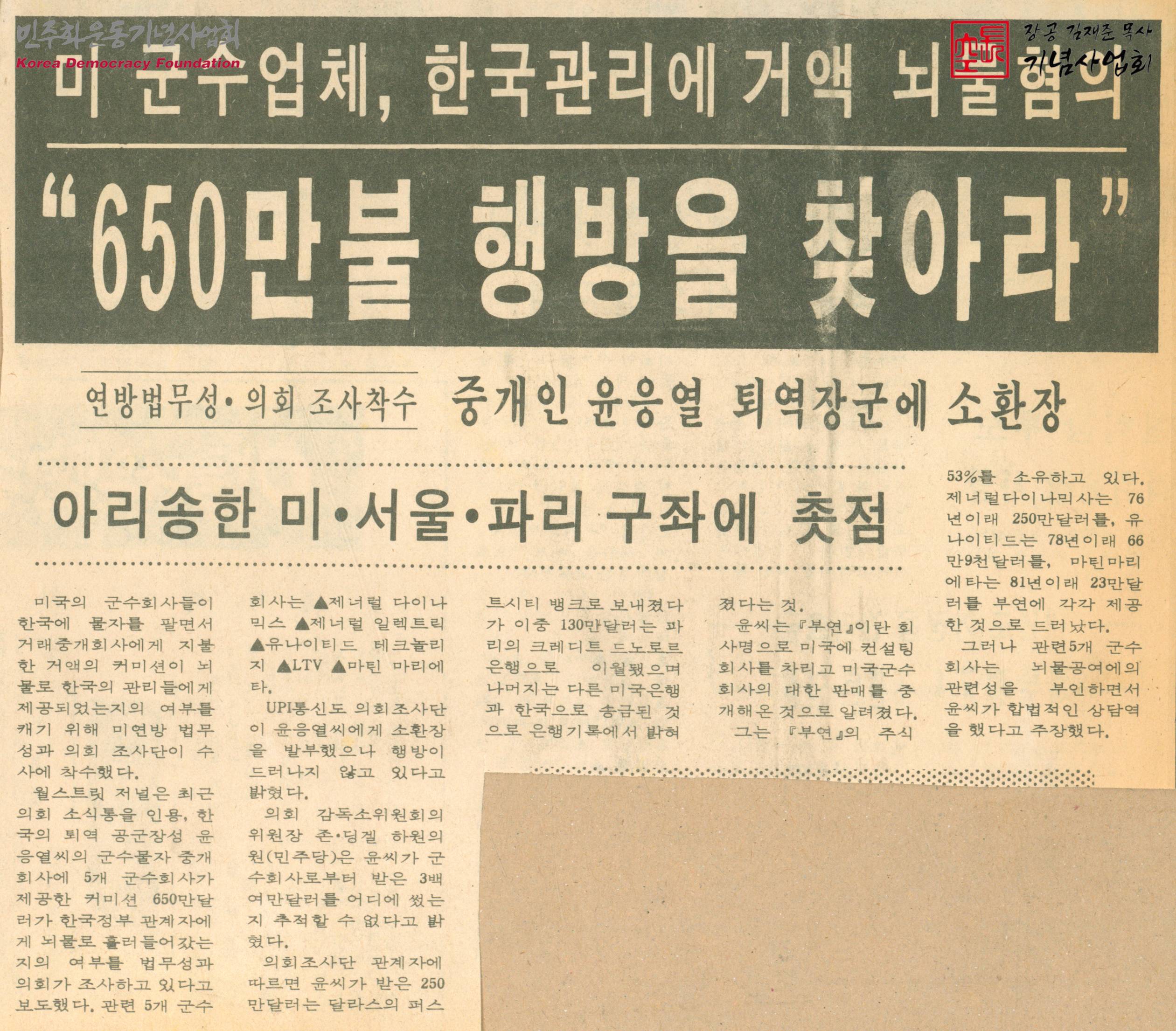 [신문스크랩]미 군수업체, 한국관리에 거액 뇌물혐의 "650만불 행방을 찾아라"