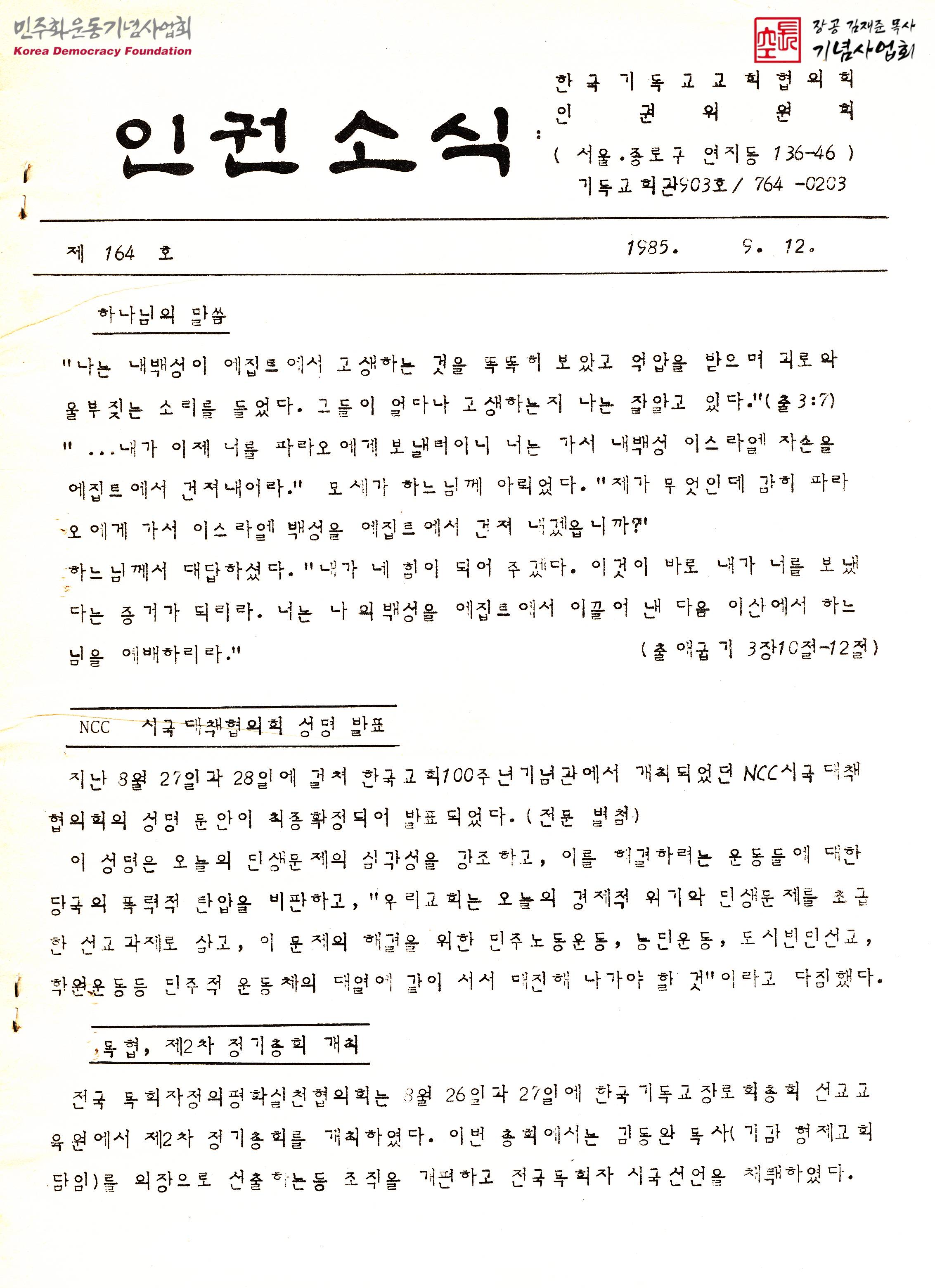 - 한국교회100주년기념관에서 개최된 NCC시국대책협의회의 성명문안이 발표되었다는 내용, 목회자정의평화실천협의회의 제2차 정기총회가 개최되었다는 것, 전남 기독교농민회 회원들이 농민생존권 보장을 요구하는 시위를 벌였다는 것 등의 내용이 수록된 정간물로 NCC성명서가 첨부됨