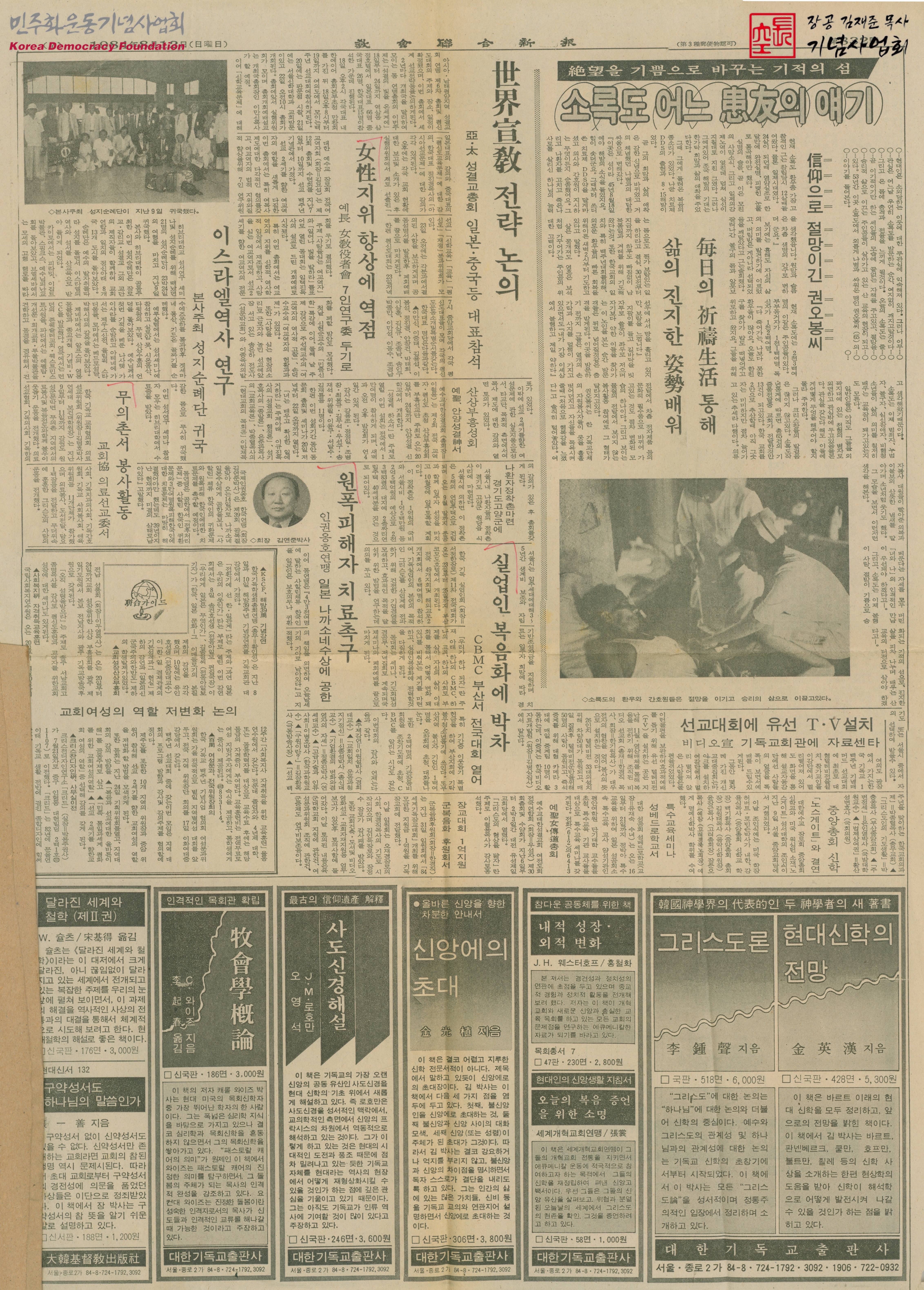 - 소록도에서 신앙으로 절망을 이긴 한 환우에 대한 내용, 아시아 태평양지역 성결교 총회에서 세계선교에 대한 전략을 논의했다는 내용, 예수교 장로회가 여성 지위향상에 역점을 두고 여교역자회 7인연구위원회를 두기로 했다는 내용 등이 수록된 신문스크랩