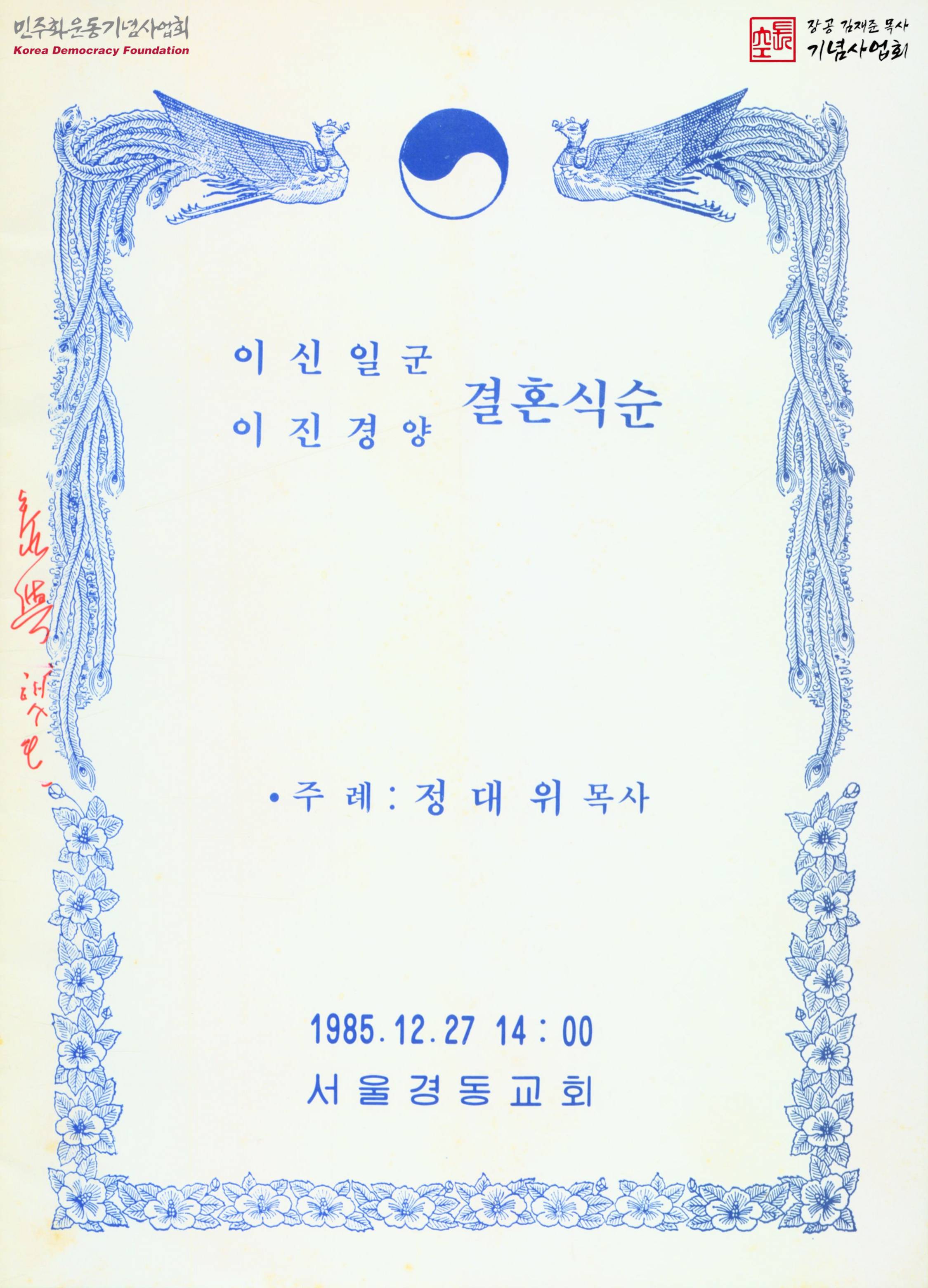 - 서울경동교회에서 열린 이신일과 이진경의 결혼식의 식순이 실린 안내문
