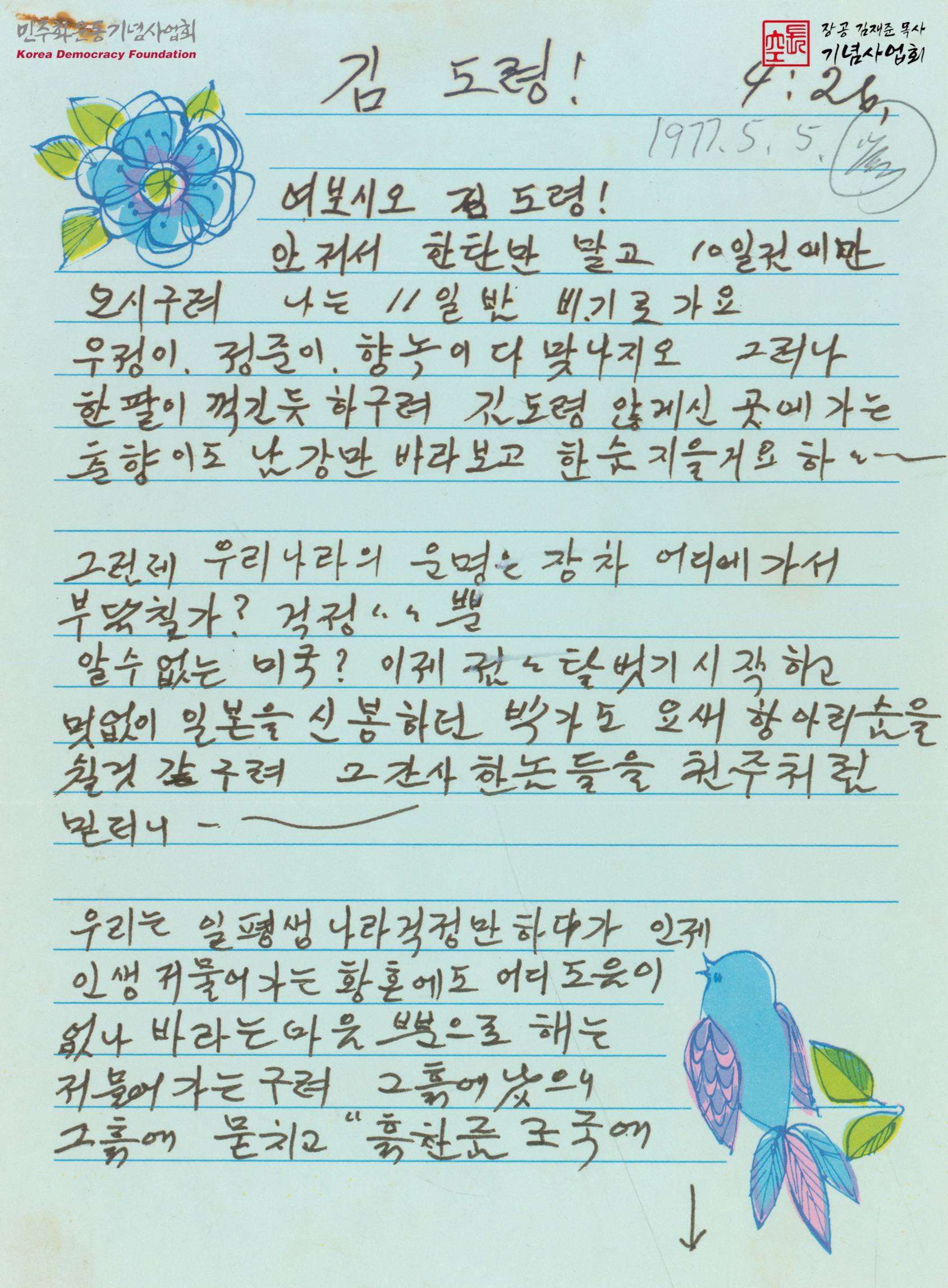 - 자신의 귀국 일정을 알리며, 김재준도 함께 귀국할 것을 독려하는 내용의 서신