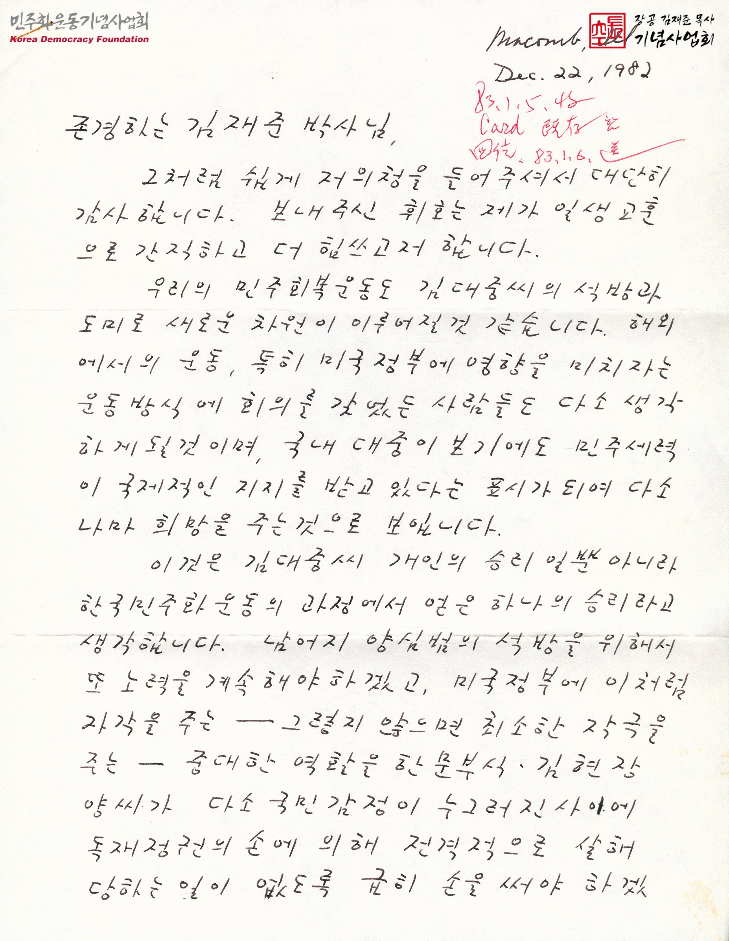 - 휘호를 보내준 김재준에 감사 인사를 전하는 한편, 김대중의 석방과 도미로 인해 정재계를 비롯한 대중에게 최소한 심리적 동요가 생겼으리라 예상되는 시점이므로 이 시기에 맞춰 운동의 새 국면을 마련하길 원한다는 내용, 한국 노동운동 탄압문제를 두고 미 노동연맹–산별조직회의(AFL–CIO)의 협조를 구해보려 한다는 향후 활동의 방향 등이 담긴 서신
