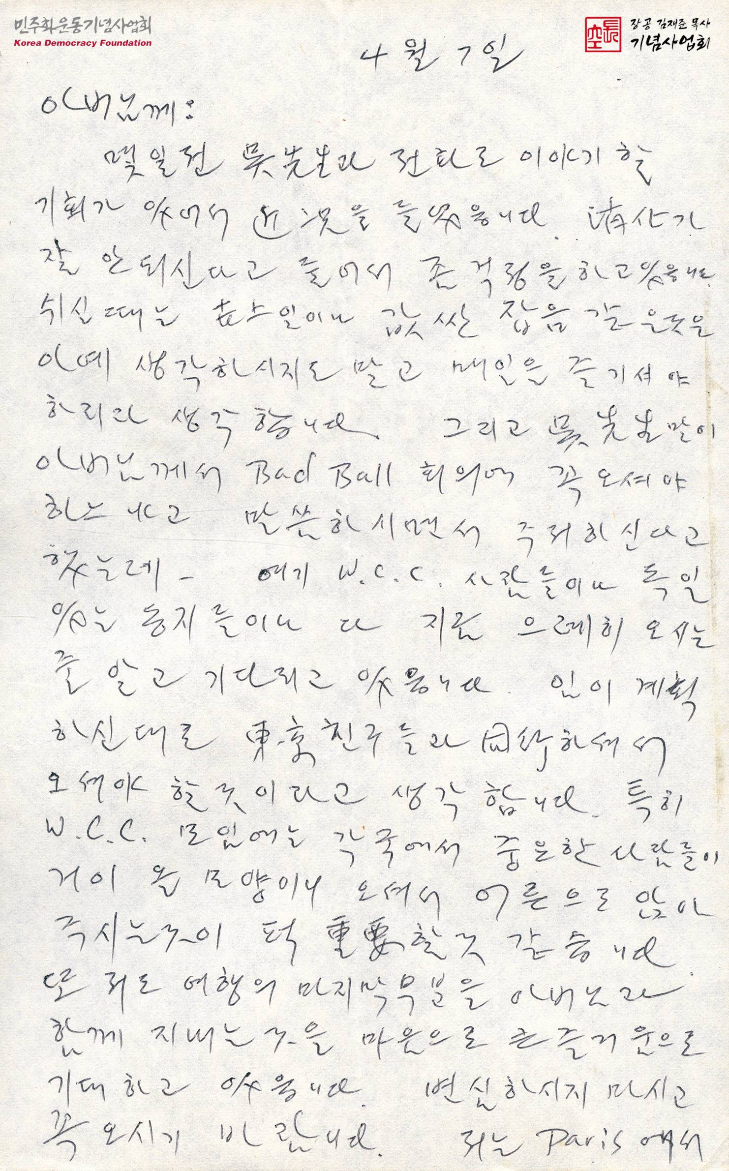 [이상철이 김재준에게 보내는 파리에서의 근황 관련 서신]