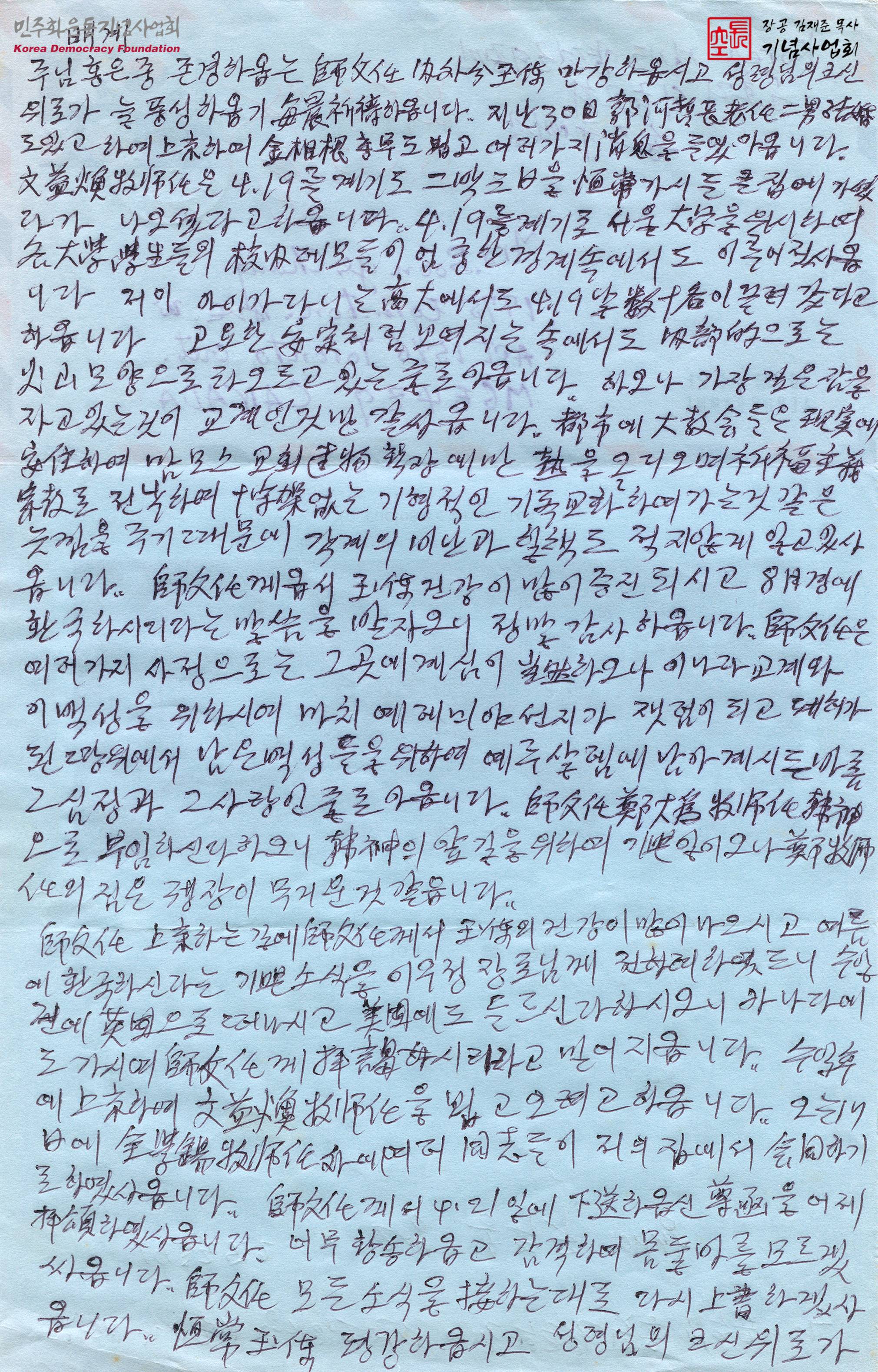 - 고려대학교 학생들의 4·19 혁명 관련 시위 진행, 대교회들의 확장에 대한 문제점, 김재준의 환국에 대한 감사함 등의 내용이 수록된 서신