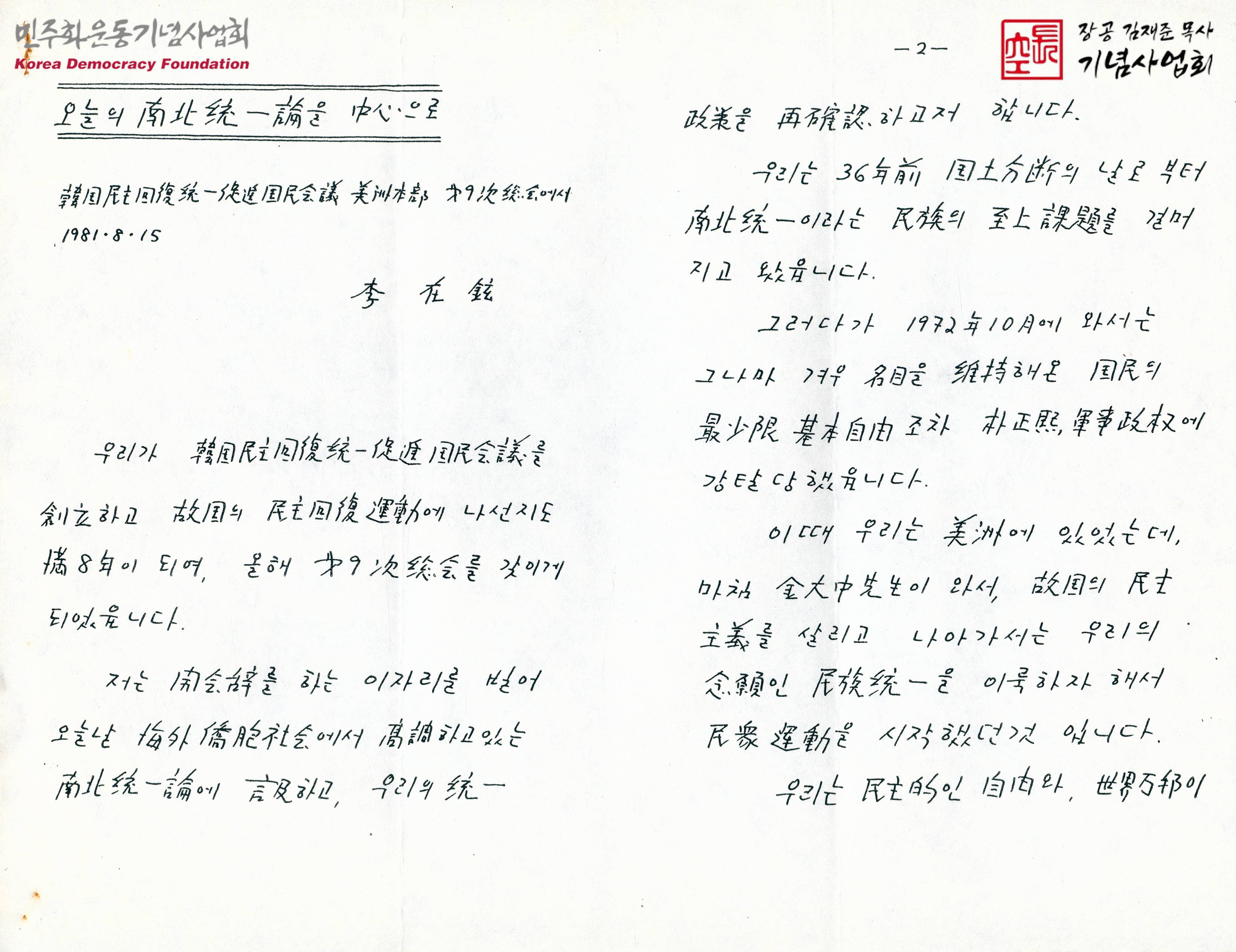 - 박정희 정권의 유신체제, 3·1구국선언, 전두환 정권의 독재채제, 민주회복과 민족통일에 처한 확고부동한 신념의 자세 필요 등의 내용이 수록된 문서