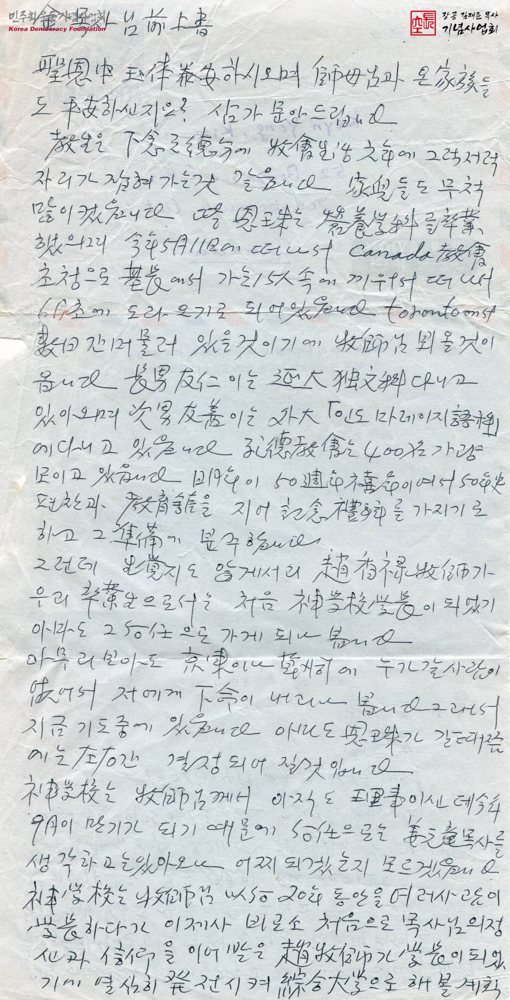- 신양섭의 근황, 토론토에서 김재준 방문 예정, 통합대학으로의 발전 계획 등의 내용이 수록된 서신