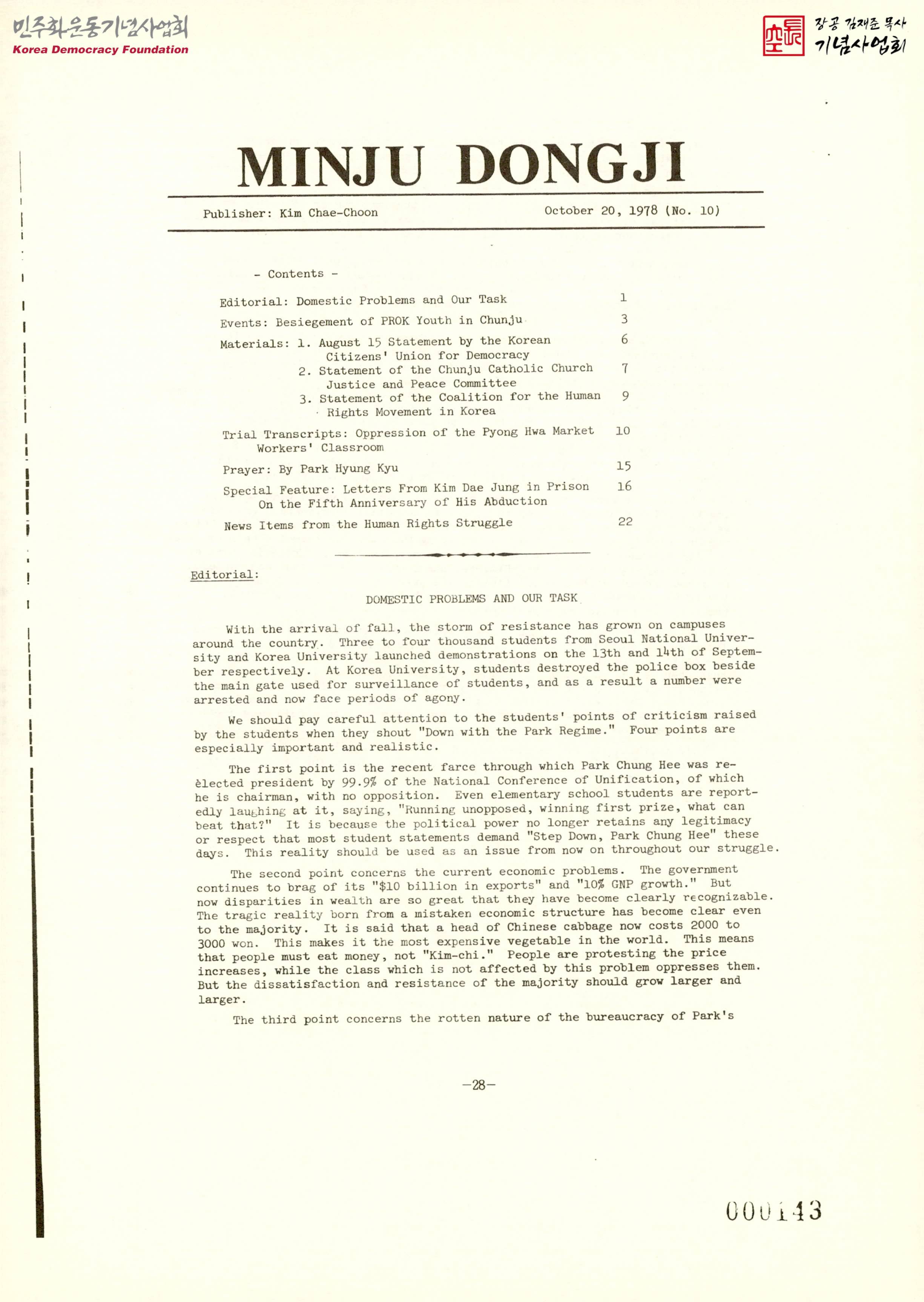 - 1978년 10월 20일자 민주동지 제10호의 영문판으로 민주주의 국민연합의 8.15선언, 천주교 전구교구 정의평화 위원회 성명서 관련 내용으로 목차는 다음과 같음 - 자료 : 국내 문제와 우리의 과제 - 사건 : 전주기장 청년 농성사건 - 자료 1, 민주주의 국민연합 1978년 8.15 선언 2. 천주교 전주교구 정의평화 위원회 성명서 3. 한국 인권운동 협의회 성명서 - 공판기록 : 어떤 재판 평화시장 노동교실 탄압사건 - 기도문 : 박형규의 기도 - 특집 : 수감 중인 김대중의 편지 - 김대중 납치 5주년을 맞이하여 - 인권소식 : 한국 기독교 교회협의회 인권소식