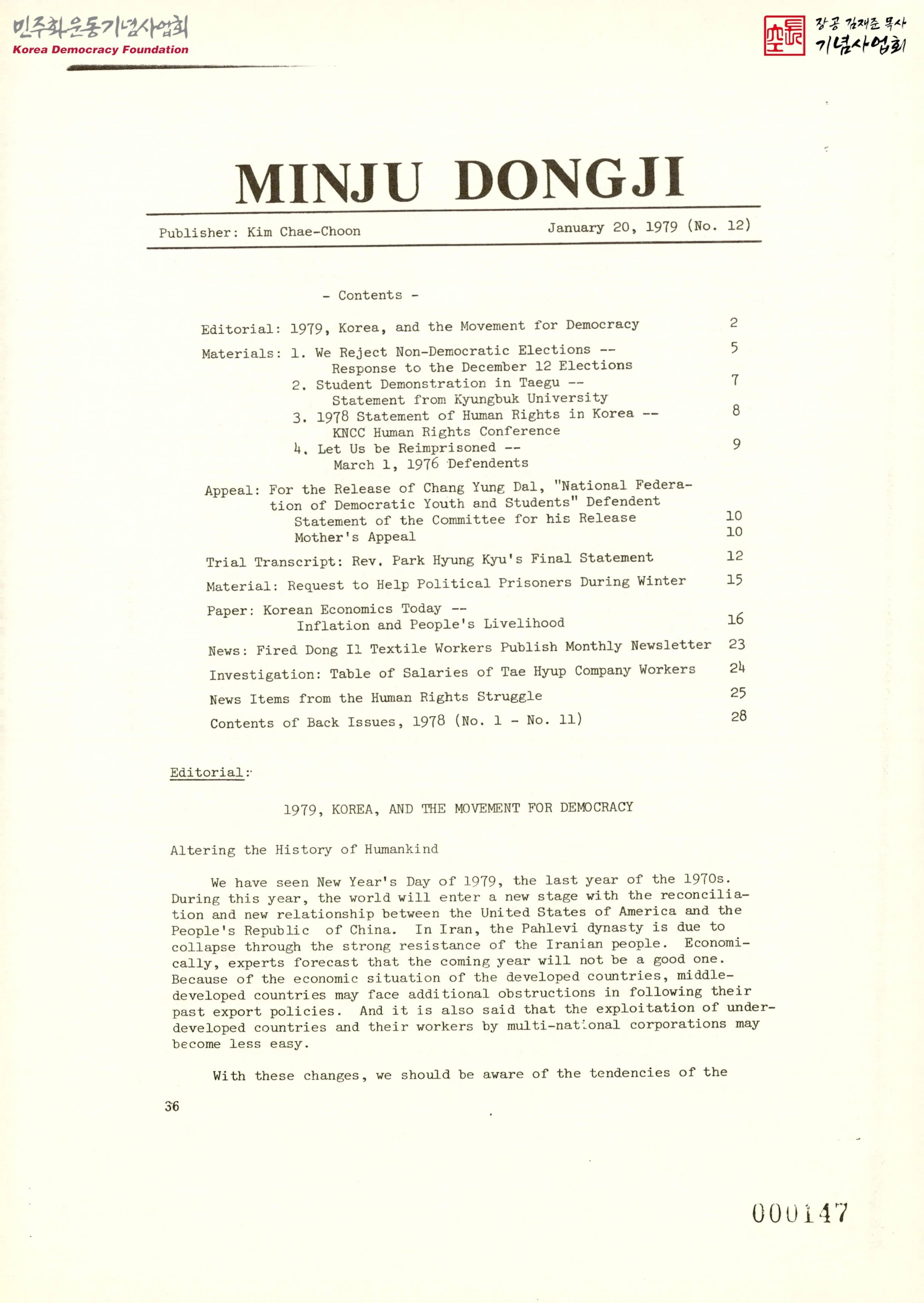 - 1979년 1월 20일자 민주동지 제12호의 영문판으로 1979년 한국의 민주화운동과 북한에 대한 제안 관련 내용 등이 수록된 문서로 목차는 다음과 같음 - 사설 : 1979년 한국과 민주화운동 - 자료 1. 반민주적 선거를 거부한다 - 12월 12일 사태에 대한 대응 2. 대구 경북대학생 데모사건 3. 1978년 한국인권선언 4. 우리도 함께 수감하라 - 1976년 3월 1일 피고인들 - 호소문 : 민청학련사건 관련자 장영달 씨 석방을 위하여 - 자료 : 양심수 활동 대답에 협조를 - 논문 : 오늘의 한국경제 - 소식 : 동일방직 해고자들 월간 「동지회보」 발간 - 조사자료 : (주)대협 근로자임금실태 - 인권소식 : 1978년 총목차(제1호- 제11호)