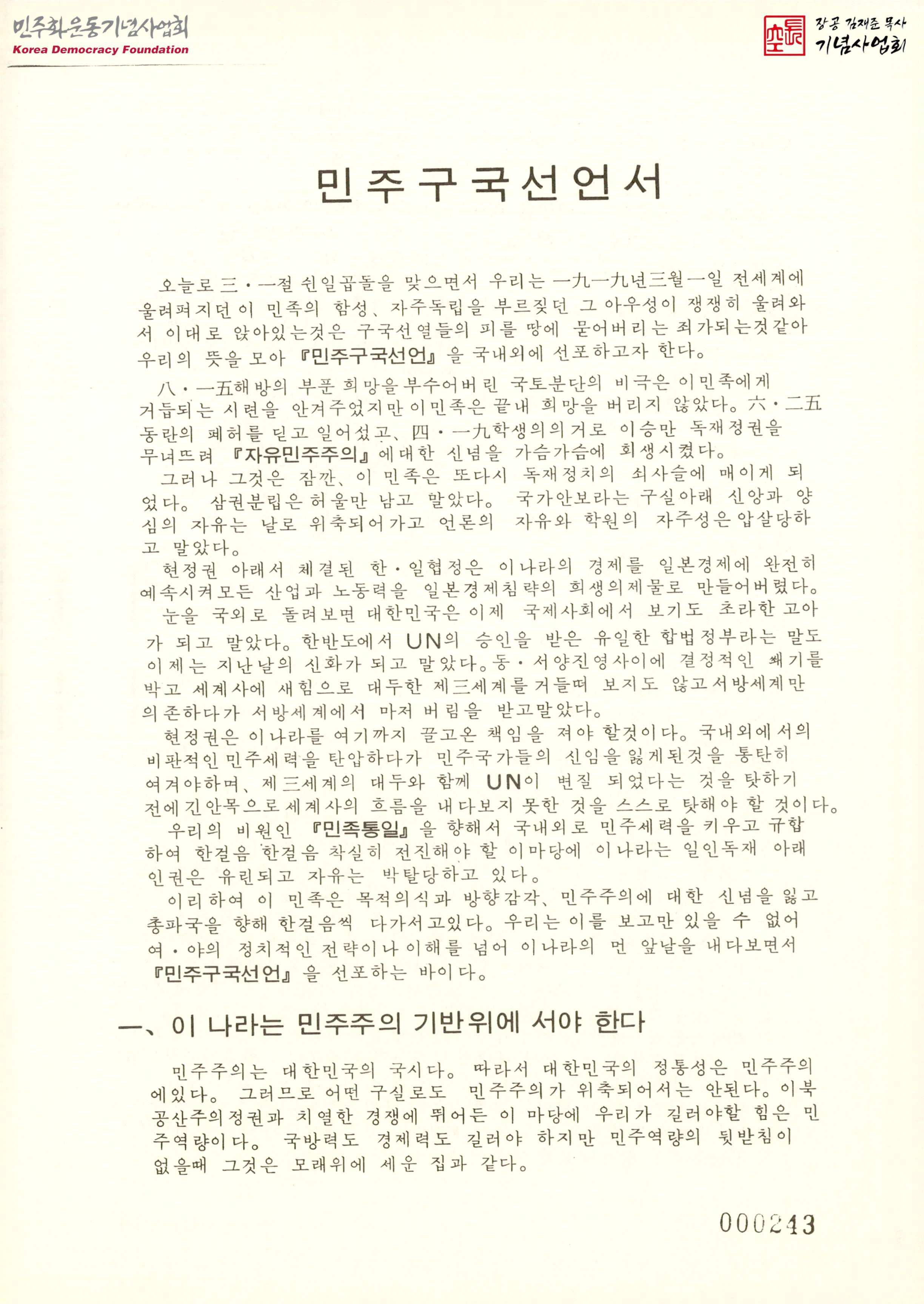 - 3·1절의 57주년을 맞이하여 이대로 앉아있는 것은 구국선열들의 피를 땅에 묻어버리는 죄가 되는 것 같아 우리의 뜻을 모아 민주구국선언을 국내외에 선포한다는 내용으로, 이 나라는 민주주의 기반 위에 서야 하며, 경제입국의 구상과 자세가 근본적으로 재검토되어야 하고, 민족통일은 오늘 이 겨레가 짊어진 지상의 과업이라고 주장하는 내용 등이 수록된 문서