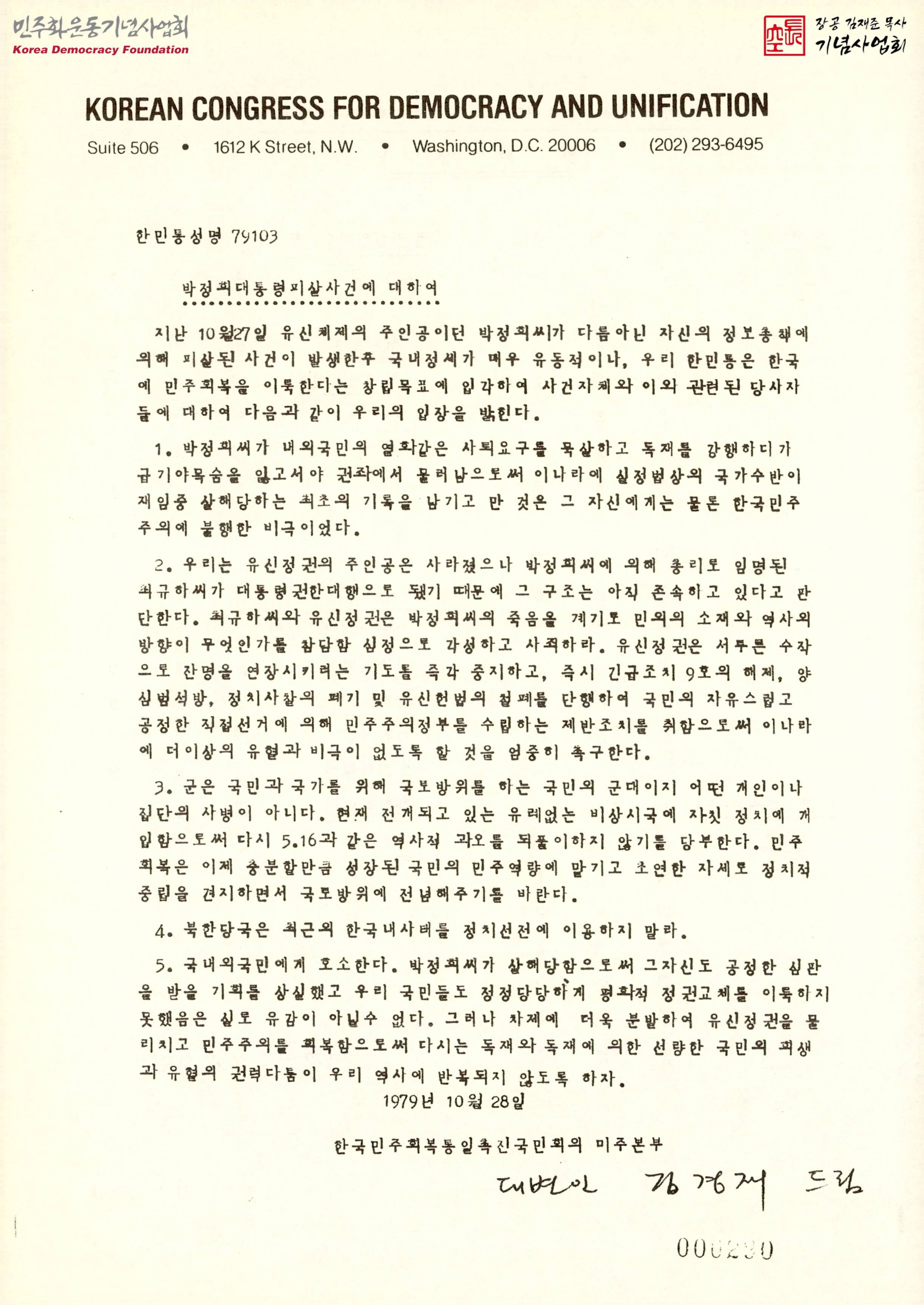 한민통 성명 : 박정희 대통령 피살사건에 대하여
