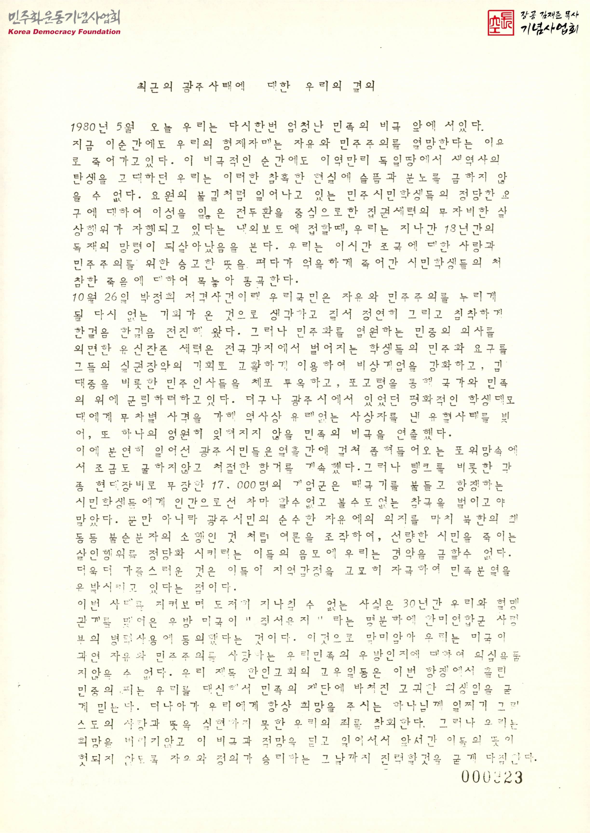 최근의 광주사태에 대한 우리의 결의