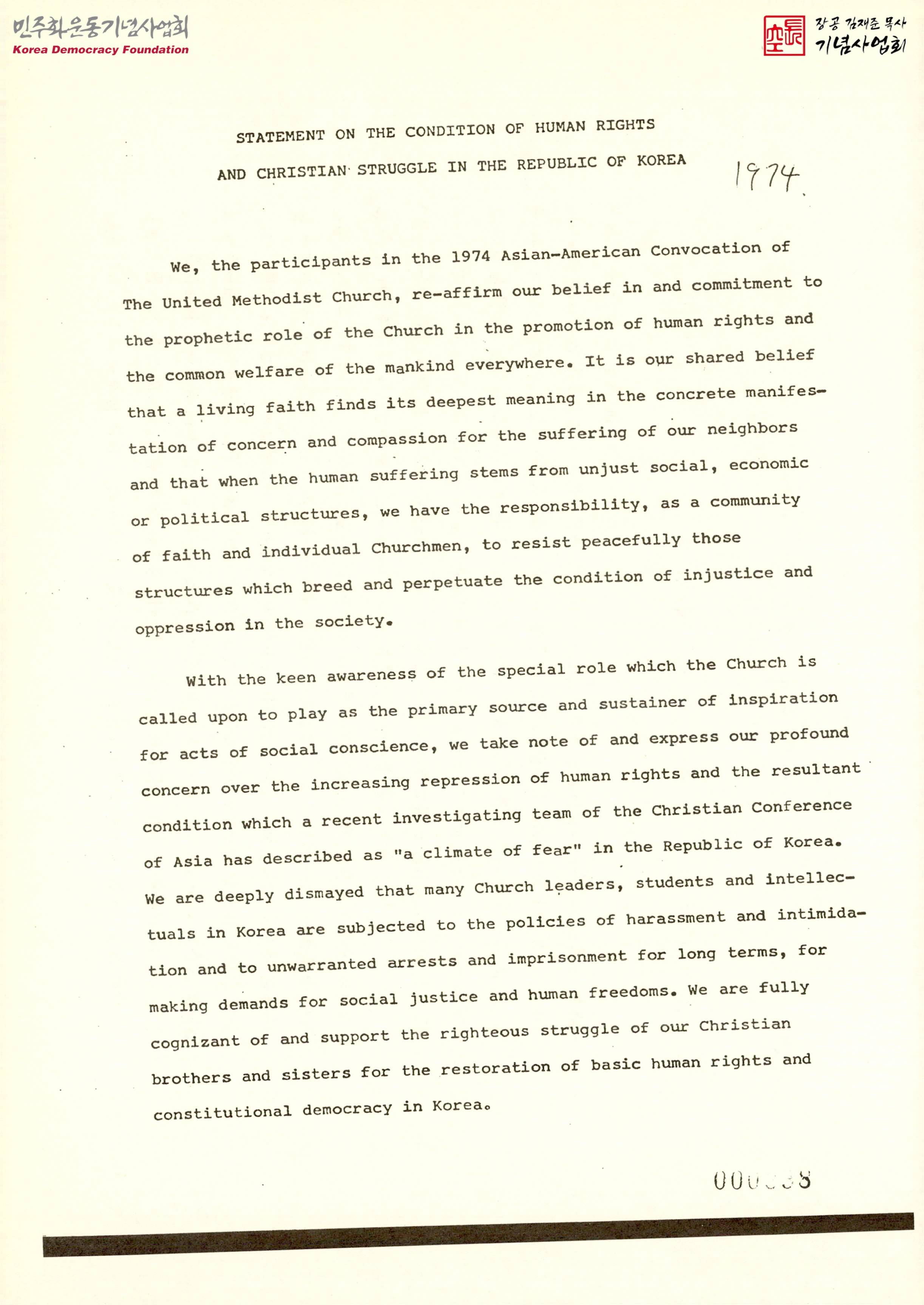 STATEMENT ON THE CONDITION OF HUMAN RIGHTS AND CHRISTIAN STRYGGLE IN THE REPUBLIC OF KOREA(대한민국의 인권 상황과 기독교인 투쟁에 관한 성명서)