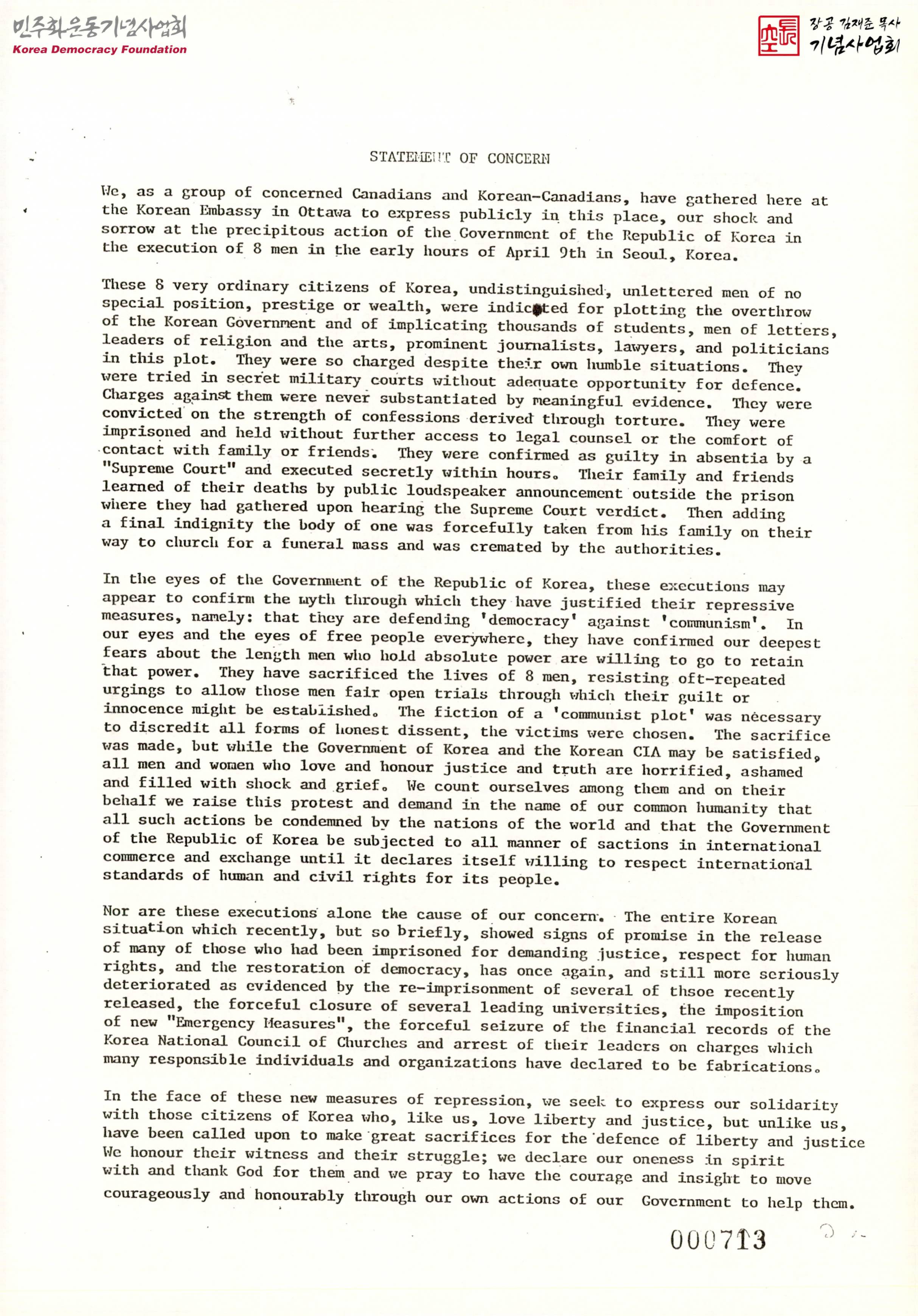 - 인민혁명당 사건으로 처형된 8인이 특별한 지위나 위신이 없음애도 한국 정부의 전복을 모의한 혐의로 기소되었고 비밀군사 법정에서 유의미하지 않은 증거로 유죄판결을 받았다고 말하며, 대한민국 정부가 국민을 위한 인권과 시민권의 국제적인 기준을 존중하겠다고 선언할 때까지 국제상거래와 교류에서 모든 방식의 조치를 받아야 한다고 항의하고 요구하는 내용의 성명서