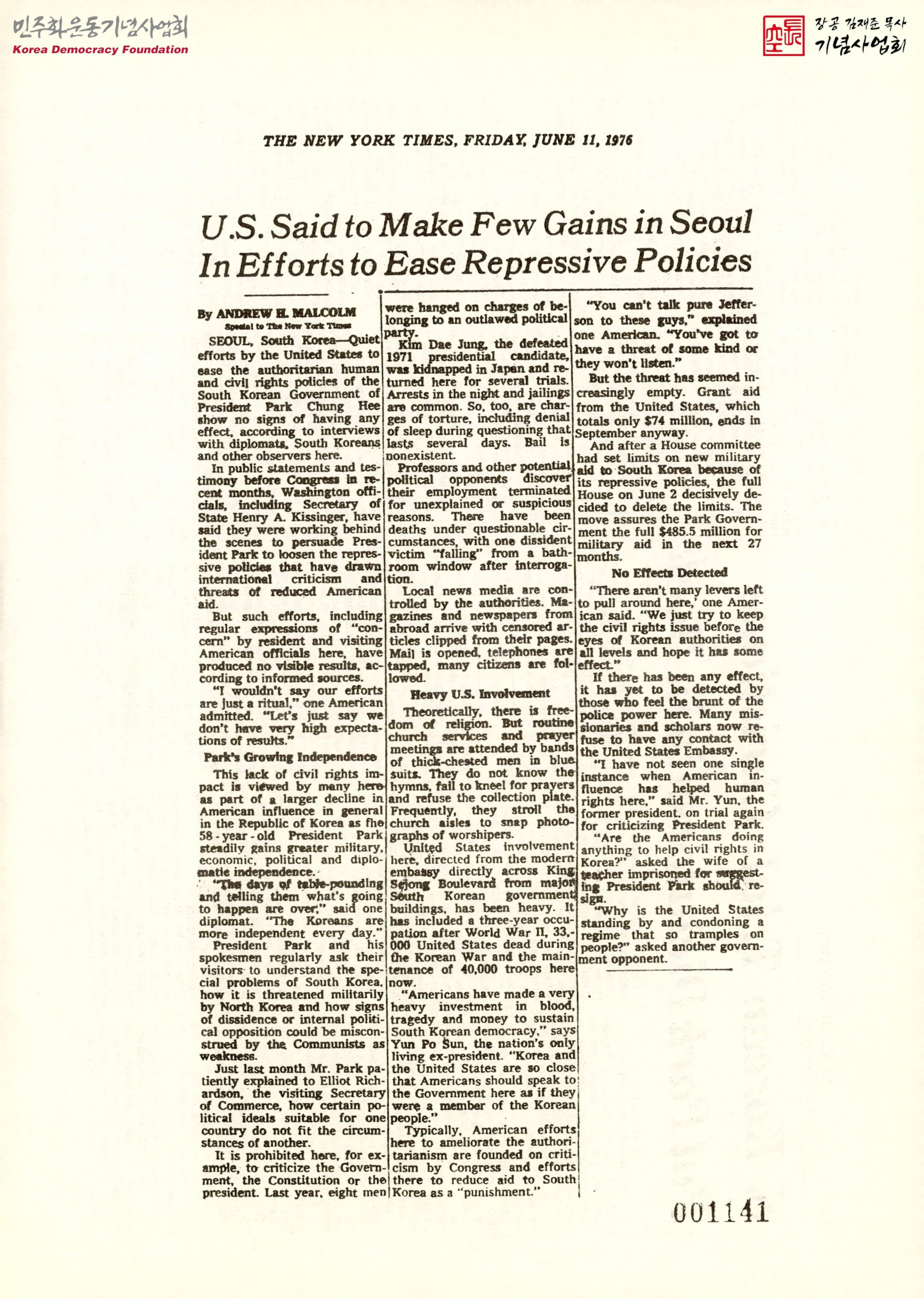 - 박정희 정권의 인권과 민권에 대한 탄압적인 정책을 완화시키려 한 미국의 노력이 효과가 없음을 밝히며, 한국에서 이루어지고 있는 국민에 대한 탄압의 예시 등이 실려 있는 기사의 스크랩