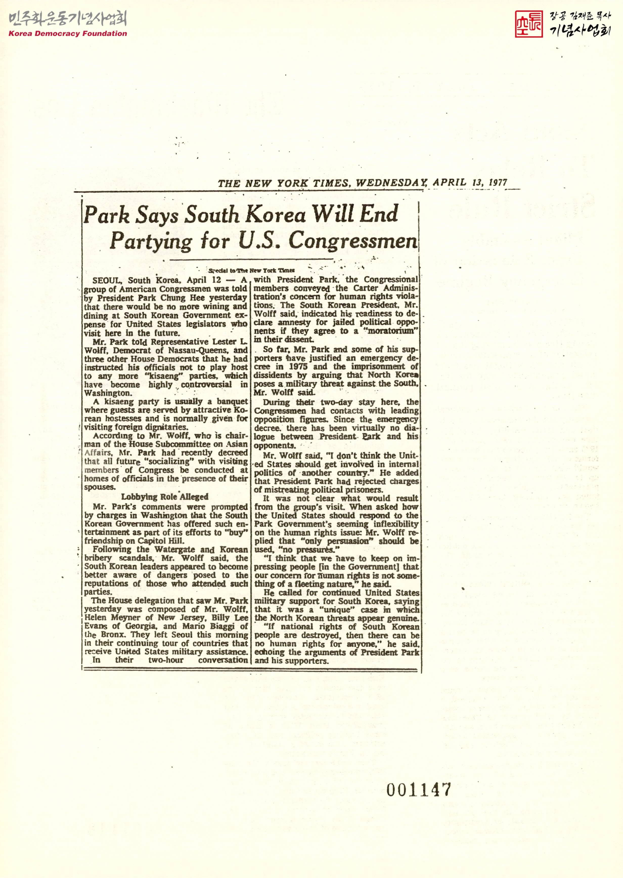 - 미국 하원 대표단이 방한해 박정희를 접견하고 야당의 유력인사들과 접촉해 나눈 대화의 내용이 실린 기사의 스크랩
