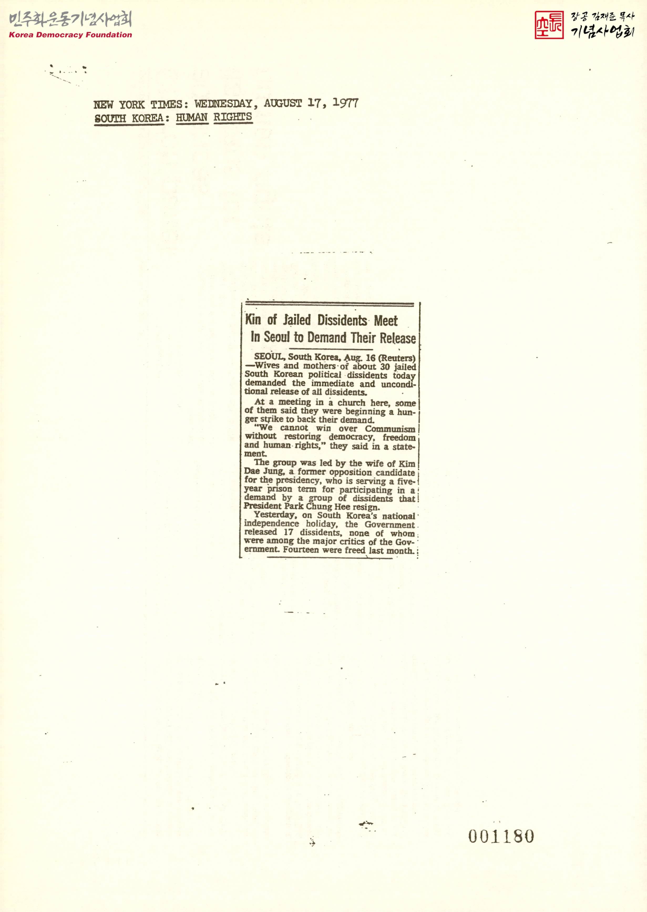 - 30명의 한국 정치 반체제 인사들의 아내, 어머니들의 반체제 인사들의 무조건적 석방 요구, 단식투쟁 전개, 회의를 주도한 인물 등의 내용이 수록된 신문기사