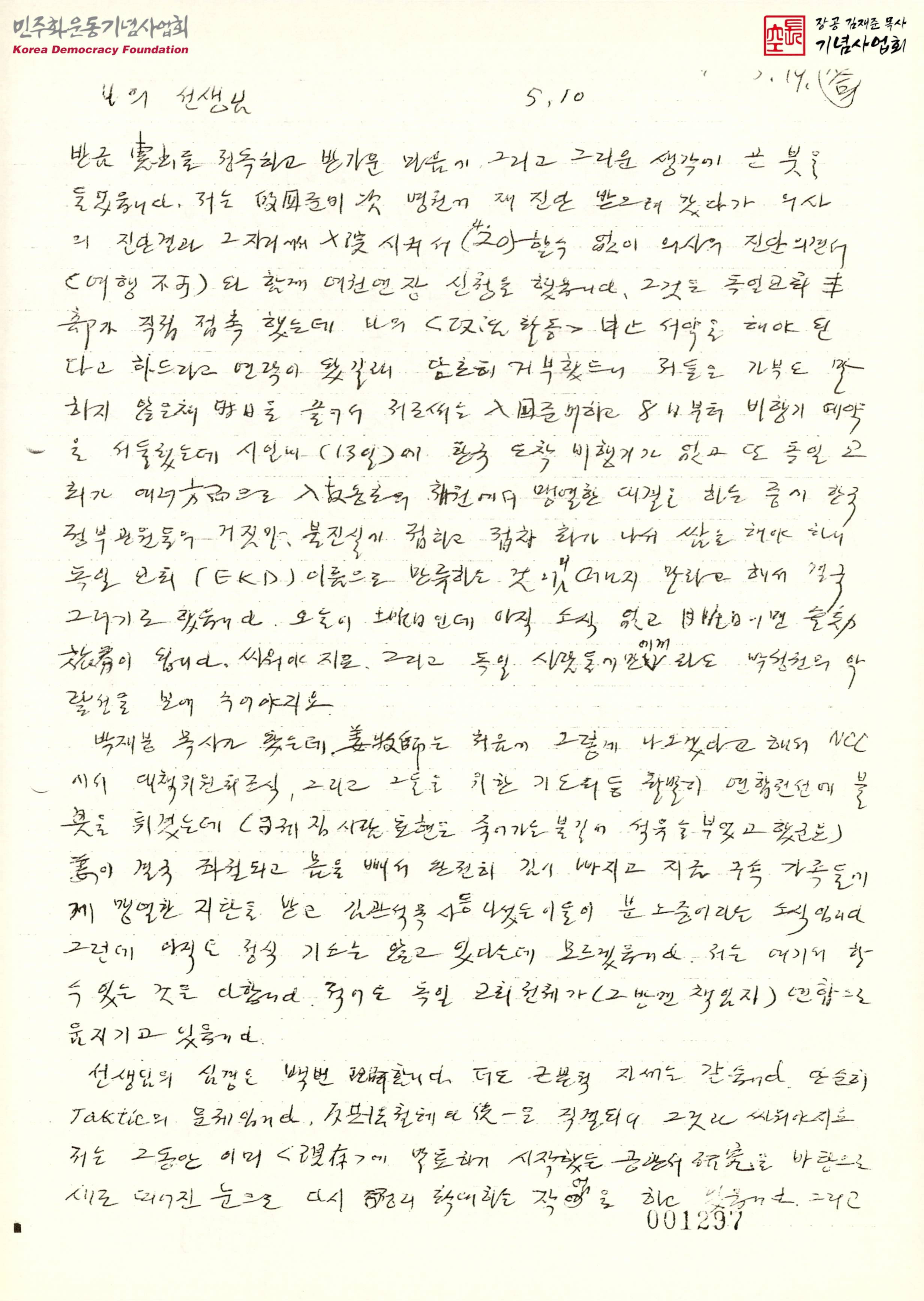 - 건강으로 인한 여권 연장, 선교교육원 수사를 위한 김성환 목사 연행, 김재준의 감수성과 개방성 등의 내용이 수록된 편지