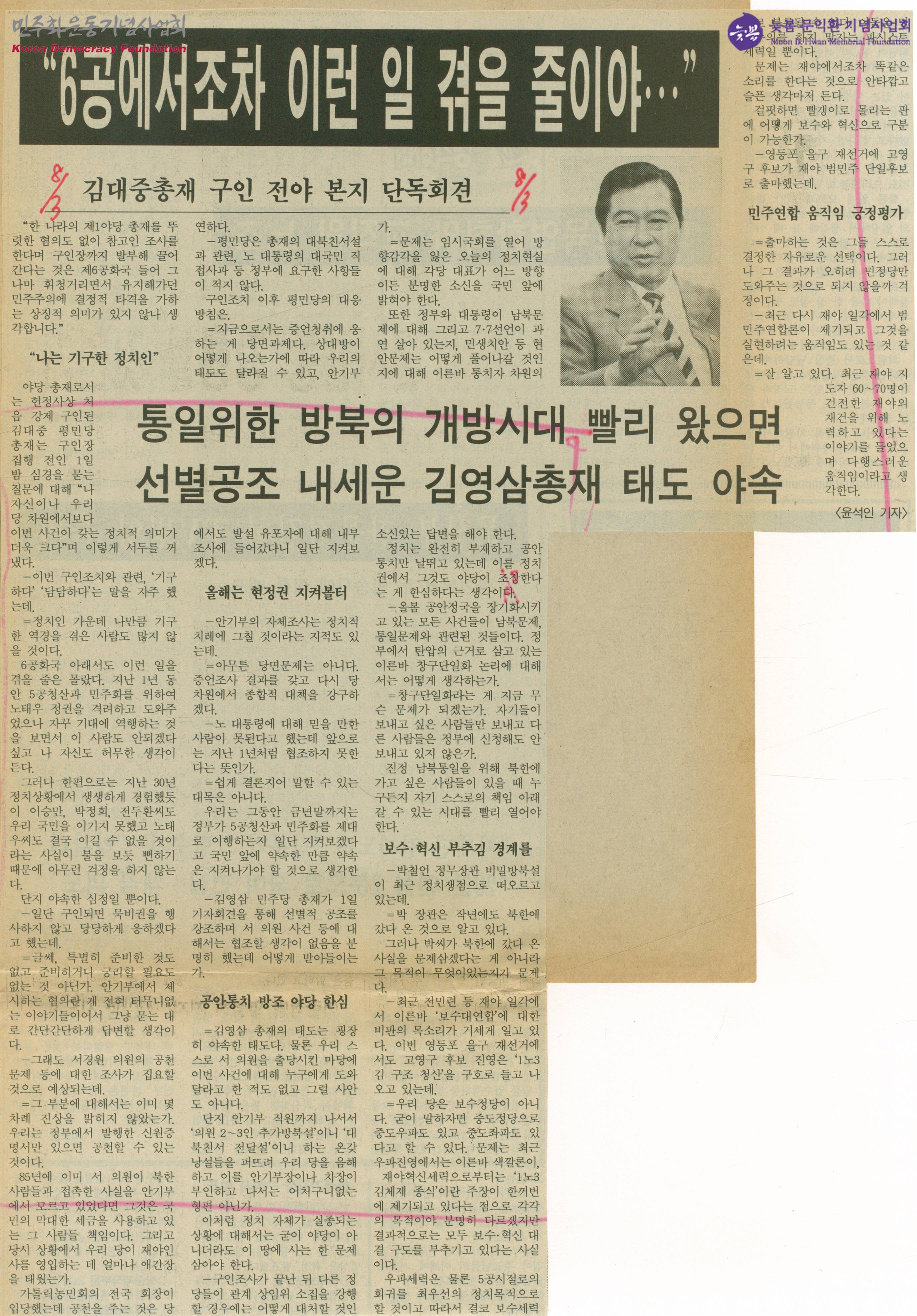 - 야당 총재로서는 헌정사상 처음 강제 구인된 김대중 평민당총재는 구인장집행전인 1일밤 심경을 묻는 질문에 대해 "나 자신이나 우리당 차원에서 보다 이번 사건이 갖는 정치적 의미가 더욱 크다"며 이렇게 서두를 꺼냈다는 내용이 수록된 신문스크랩
