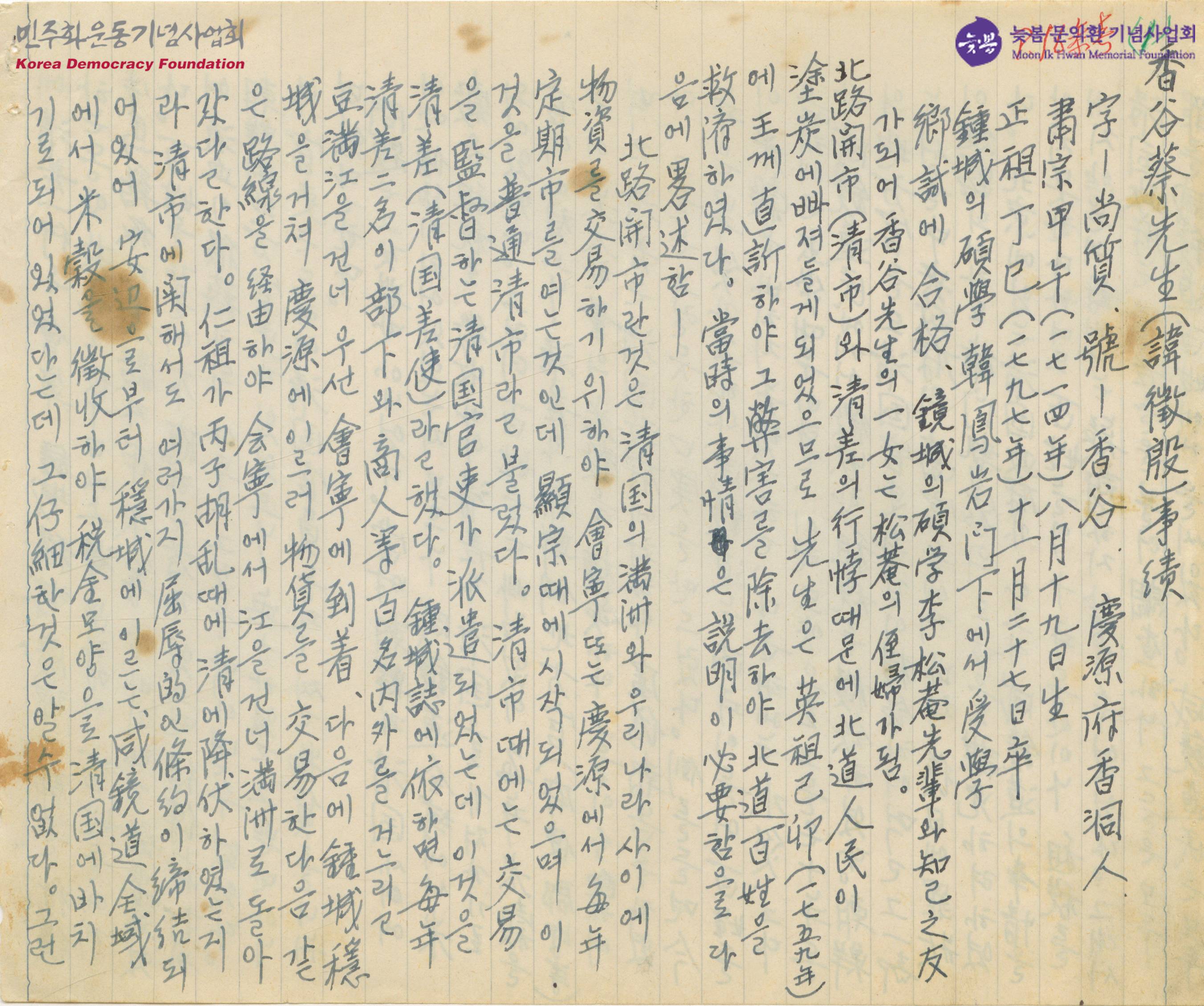 - 18세기 조선의 한 문신에 관한 내용을 적은 것으로 추정되는 글