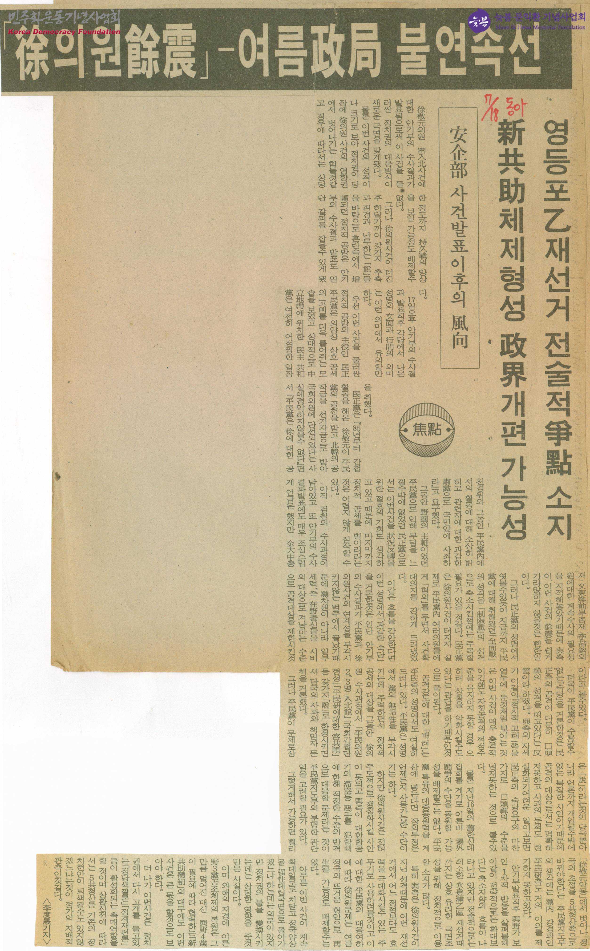 「徐의원 餘震」-여름政局 불연속선
