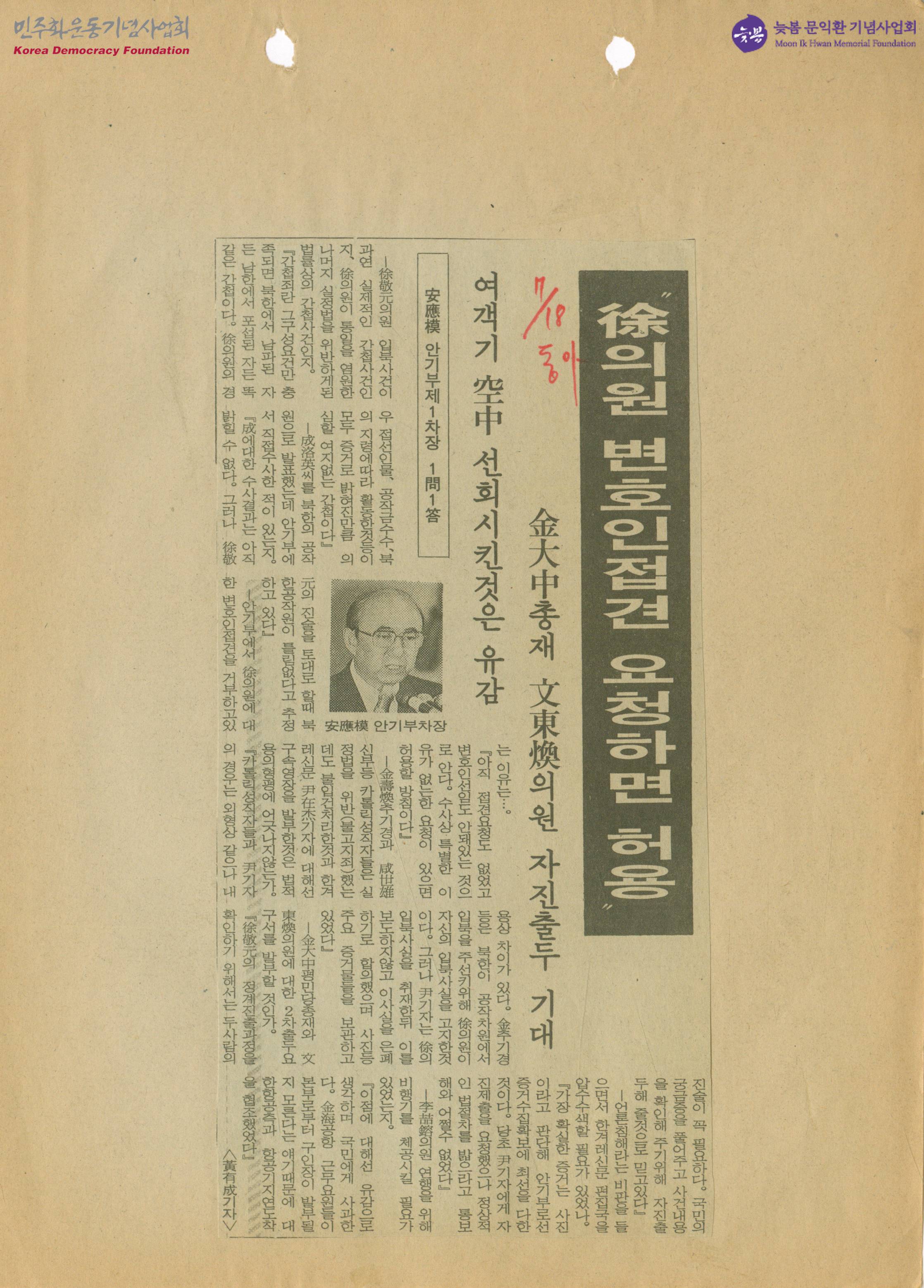 - 서경원 의원 입북사건의 성격, 안기부에서 서경원 의원에 대한 변호인 접견을 거부하고 있는 이유, 김대중과 문동환에 대한 2차 출두요구서 발표 예정 여부 등에 대해 안응모 안기부차장과 진행한 1문1답 내용이 게재된 기사가 수록된 신문스크랩