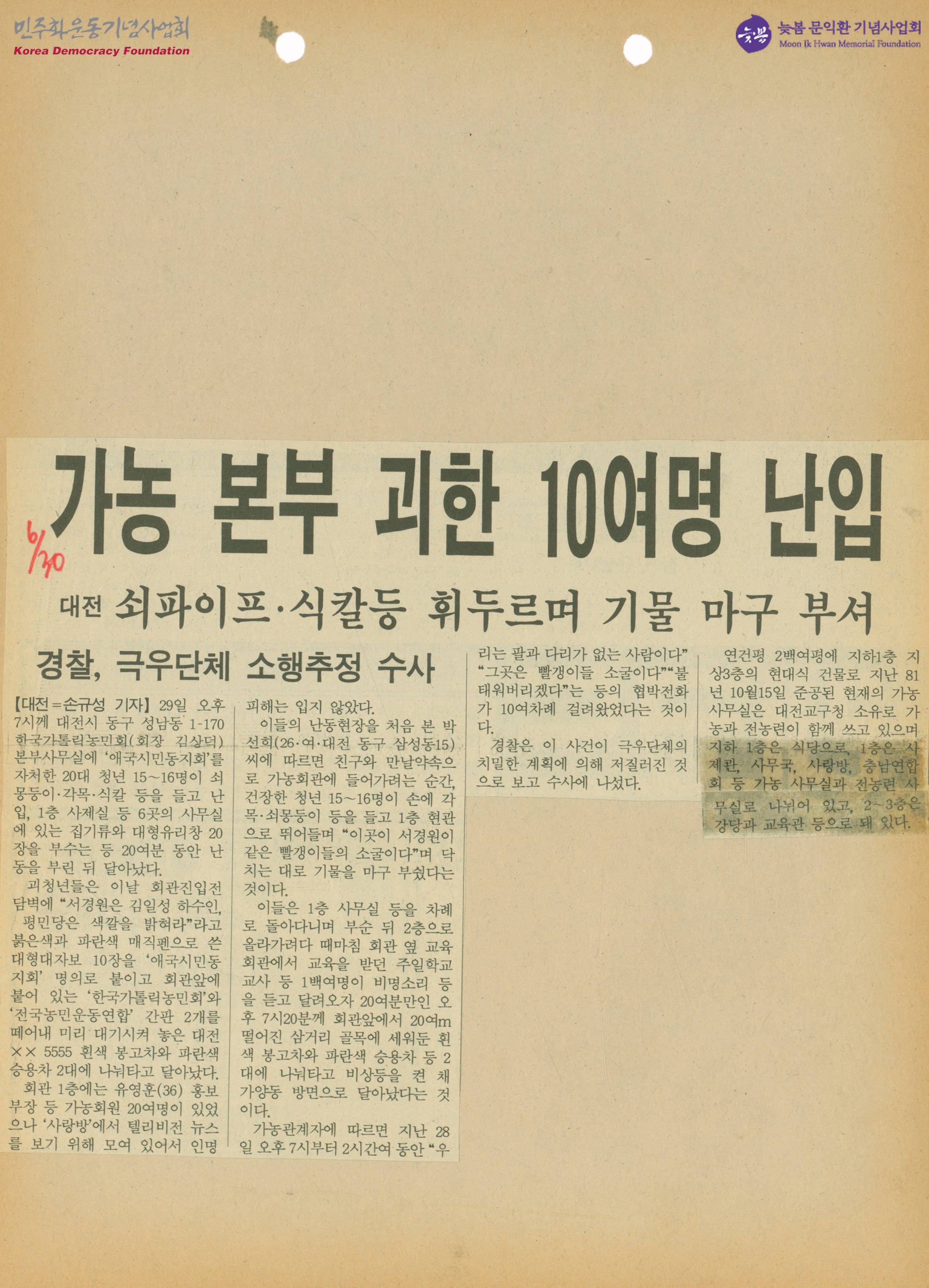 - 한국가톨릭농민회 본부 사무실에 '애국시민동지회'를 자처한 20대 청년 15~16명이 난동을 부린 뒤 달아났다는 내용의 기사가 수록된 신문스크랩