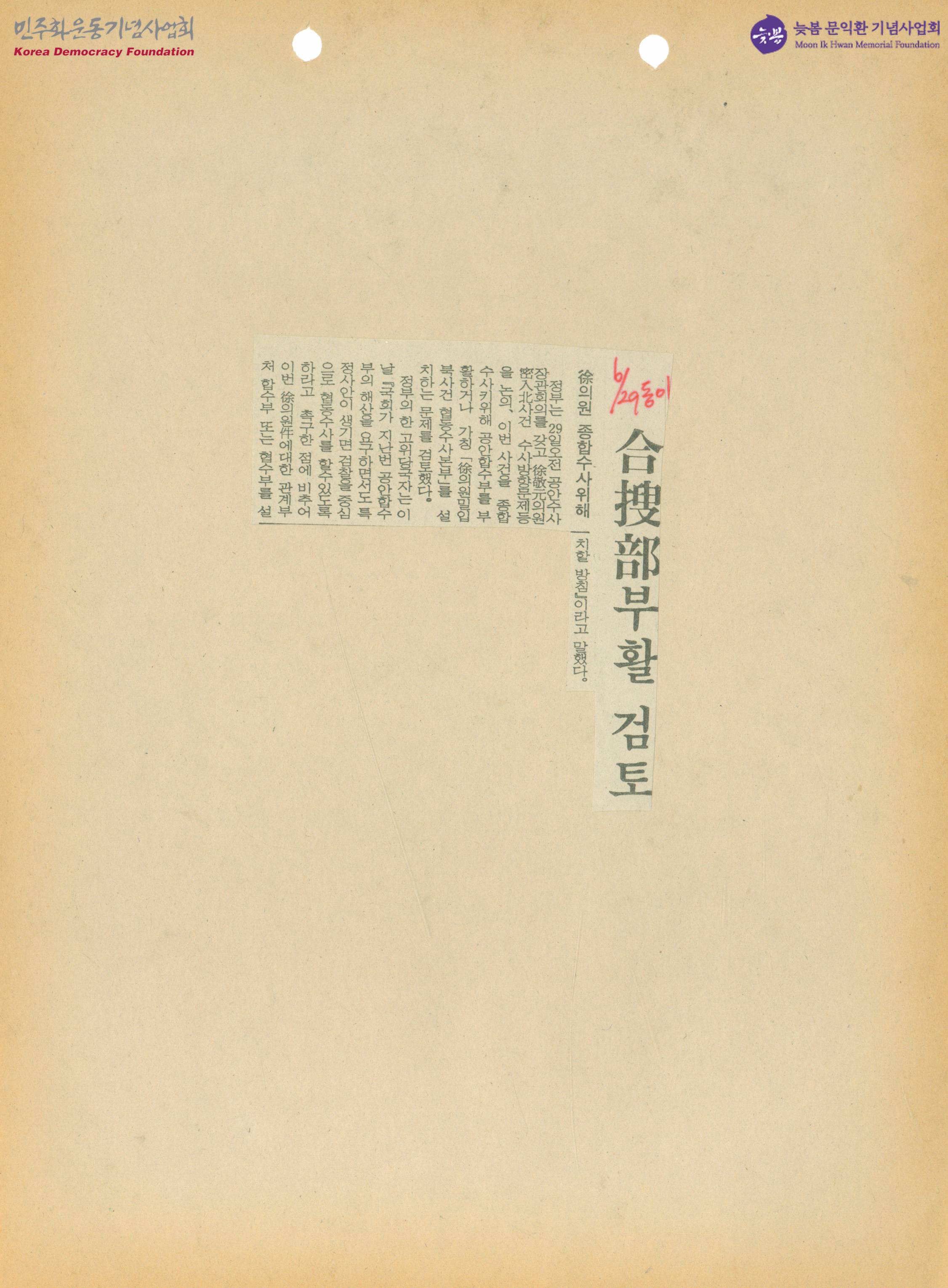 - 정부가 공안 수사 장관 회의에서 서경원 밀입북 사건을 종합적으로 수사하기 위해 공안합수부를 부활하거나 '서 의원 밀입북 사건 합동수사본부'를 설치하는 문제를 검토했으며, 평민당은 당기위원회, 당무회의, 의원 총회 등을 열어 서경원의 제명결의안을 통과시켰다는 내용의 기사가 수록된 신문스크랩