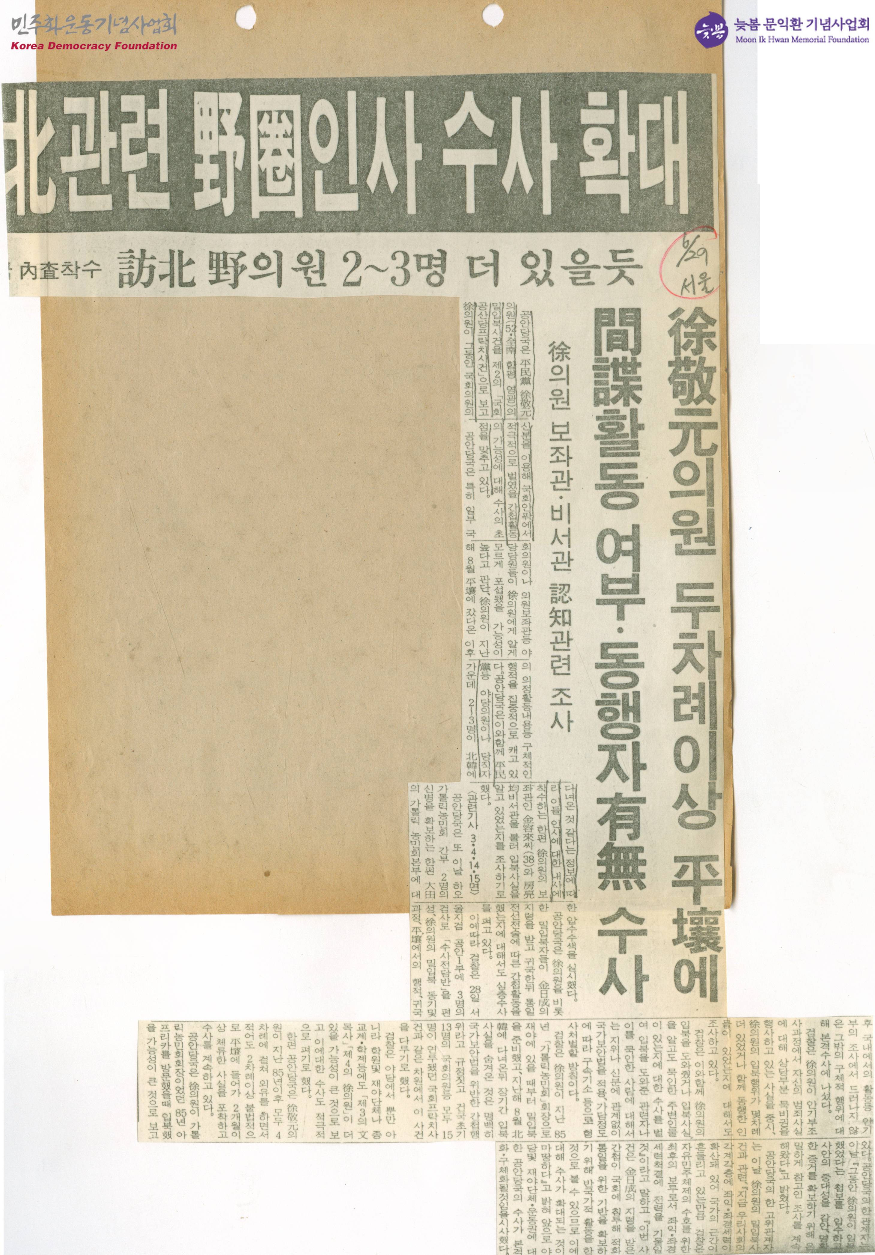 - 평민당 서경원 밀입북사건을 제2의 '국회 공산당 프락치 사건'으로 보고 서경원이 국회의원의 신분을 이용해 간첩활동을 적극적으로 벌였을 가능성에 대해 수사의 초점을 맞추고 있다는 내용의 기사가 수록된 신문스크랩