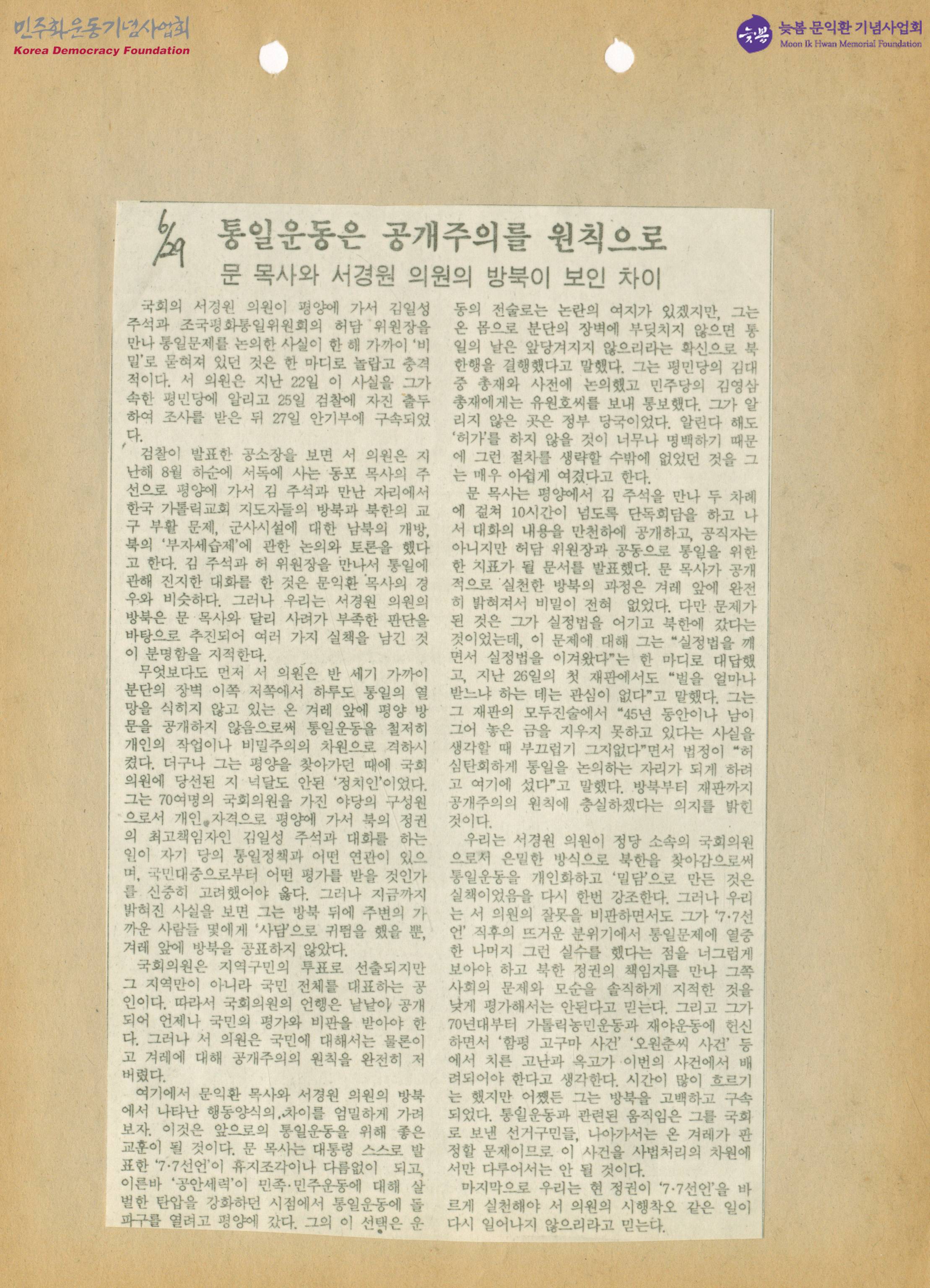 통일운동은 공개주의를 원칙으로 문 목사와 서경원 의원의 방북이 보인 차이