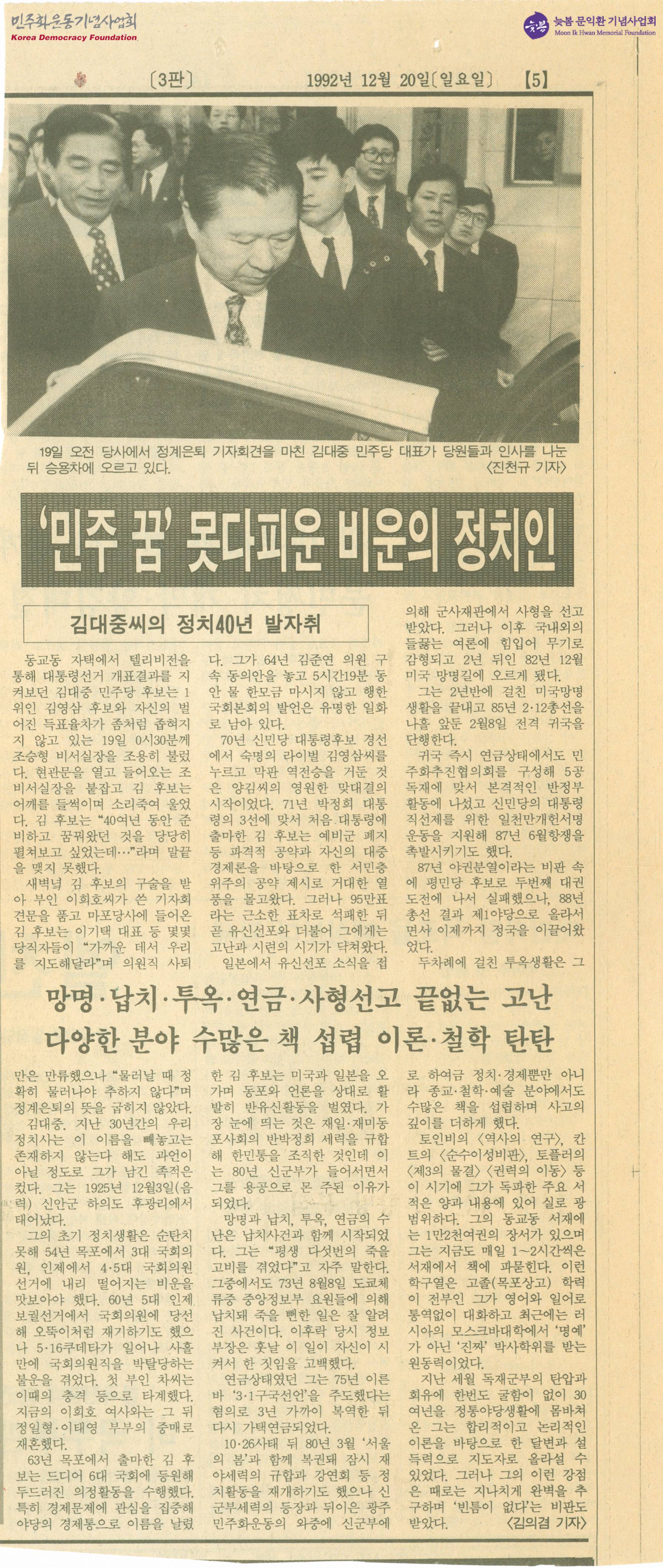 [신문스크랩]'민주 꿈' 못다피운 비운의 정치인