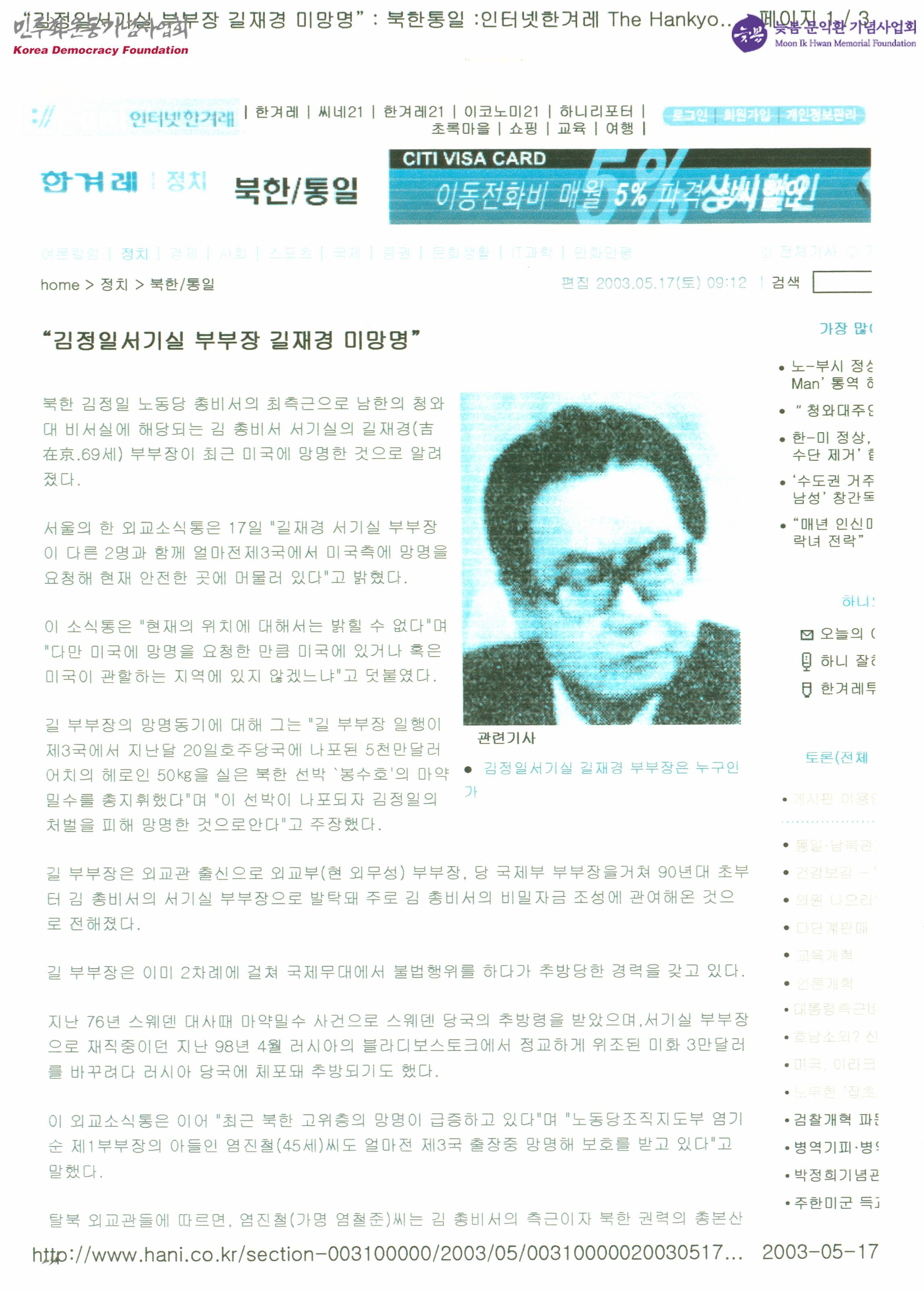 [스크랩]"김정일서기실 부부장 길재경 미망명"