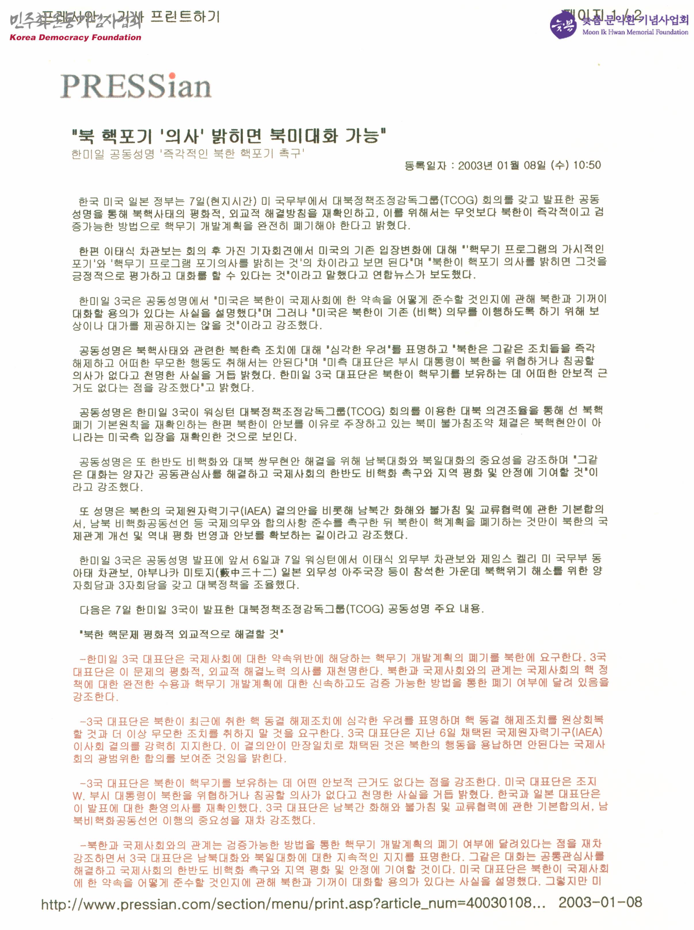 - 한·미·일 정부는 미 국무부에서 대북정책조정감독그룹 회의를 갖고 발표한 공동성명을 통해 북핵사태의 평화적, 외교적 해결방침을 재확인하고, 이를 위해서는 무엇보다 북한이 즉각적이고 검증가능한 방법으로 핵무기 개발을 완전히 폐기해야 한다고 주장하며, 한미일 3국은 공동성명에서 미국은 북한이 국제사회에 한 약속을 어떻게 준수할 것인지에 관해 북한과 대화할 용의가 있으나 북한이 기존 의무를 이행하도록 하기 위해 보상이나 대가를 제공하지는 않을 것이라고 강조한 내용 등이 수록된 문서