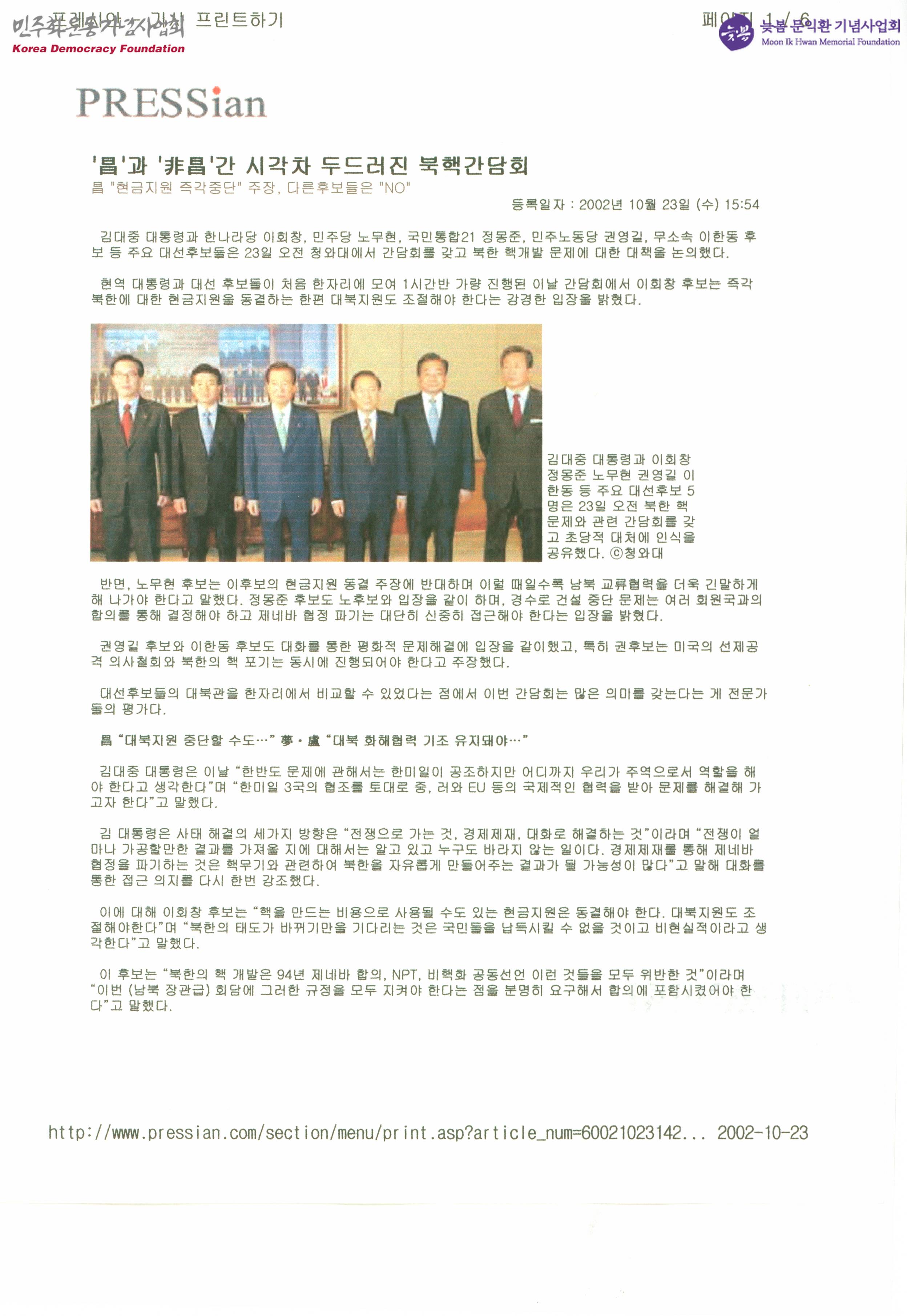 - 김대중 대통령과 한나라당 이회창, 민주당 노무현, 국민통합21 정몽준, 민주노동당 권영길, 무소속 이한동 후보 등 주요 대선후보들은 23일 오전 청와대에서 간담회를 갖고 북한 핵개발 문제에 대한 대책을 논의했으며, 이회창 후보는 즉각 북한에 대한 현금지원을 동결하는 한편 대북지원도 조절해야 한다는 강경한 입장을 밝혔고, 노무현 후보는 이후보의 현금지원 동결 주장에 반대하며 이럴 때일수록 남북 교류협력을 더욱 긴말하게 해 나가야 한다고 주장했다는 내용 등이 수록된 문서