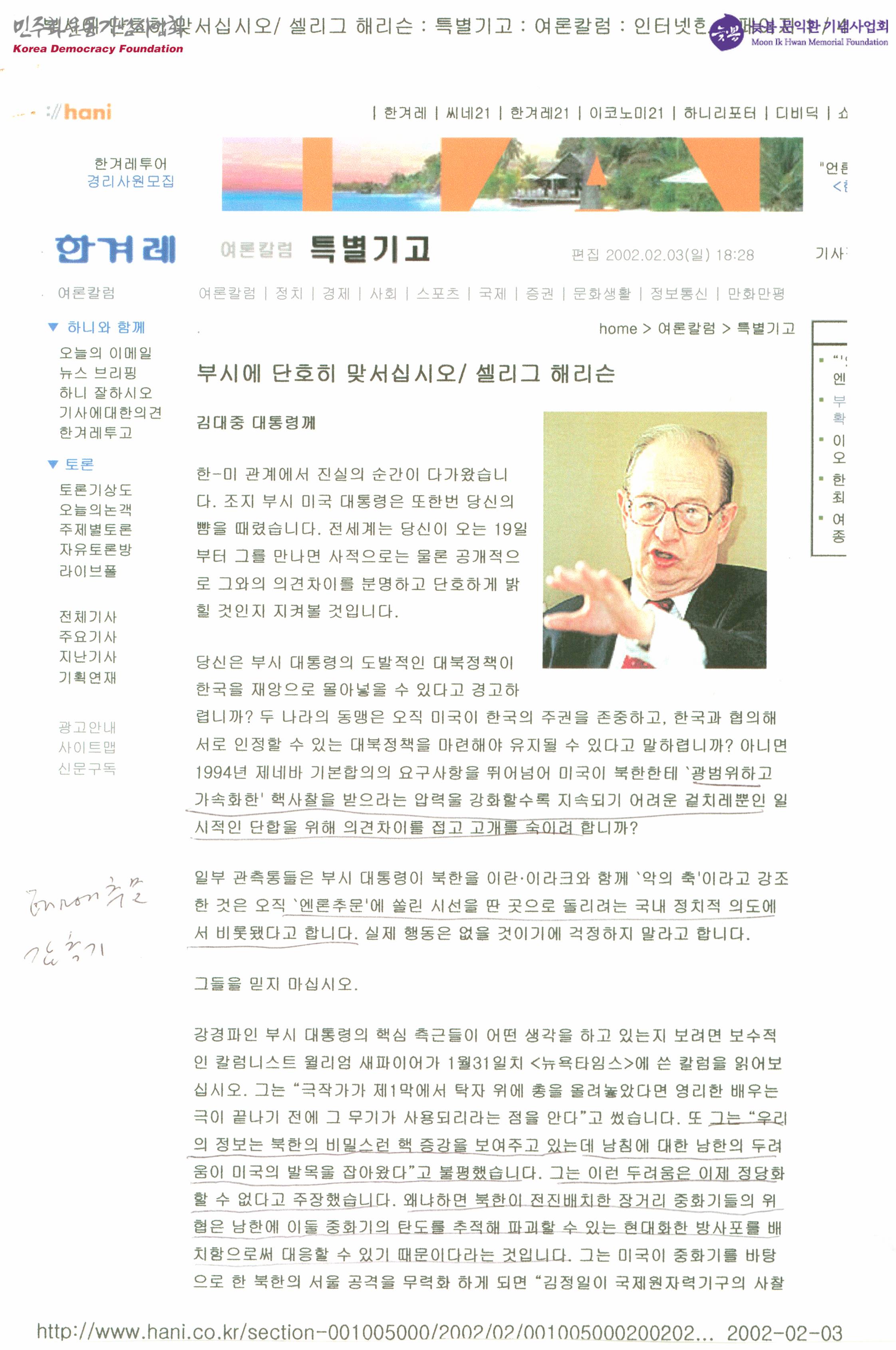 - 경수로 1기 사업의 상당 부분 완료 시기까지는 8단계가 있으니 원자력기구의 핵사찰을 8단계로 나눠 경수로 건설계획의 각 단계별 공정완료와 직접 연계하는 것, 부시 대통령에게 핵사찰 타협안을 제안하며 94년 합의사항 가운데 이뤄진 것과 이뤄지지 않은 것을 상기시킬 것, 부시 대통령에게 북한이 99년 장거리미사일을 시험발사하지 않겠다는 약속을 지켰다는 점을 상기시킬 것 등을 요구하며 셀리그 해리슨이 김대중 대통령에게 보내는 문서